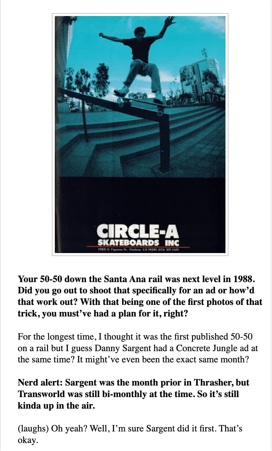 I think as far as lore goes - Kele Rosencranz had the first handrail boardslide advert (although thereās debate about whether it was caveman and/or not landed).