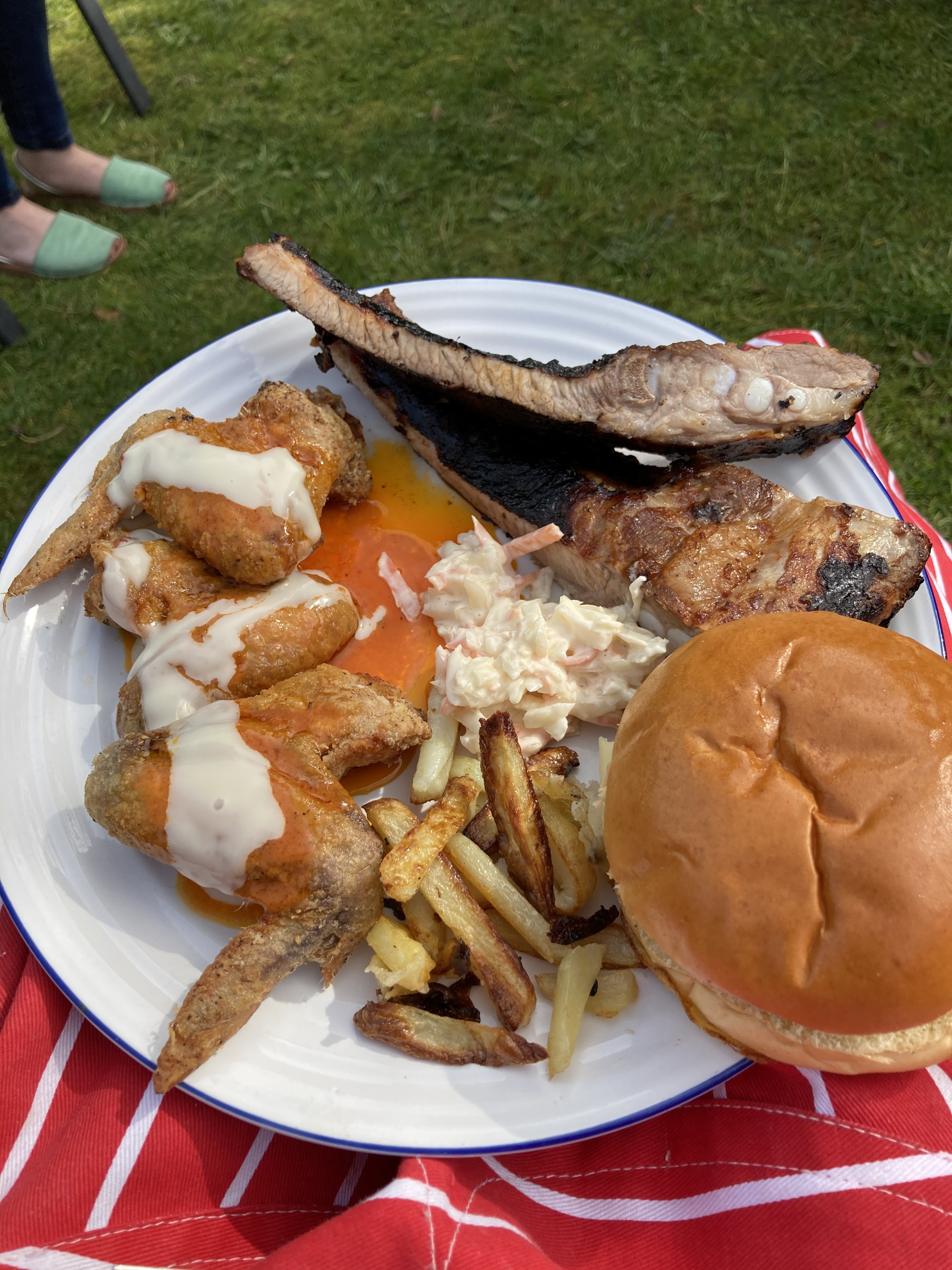 Pork belly ribs, slow cooked then grilled outside, chicken wings with my own spice blend, hot sauce and blue cheese dressing, burger with leerdammer and a brioche bun, coleslaw and homemade chips.