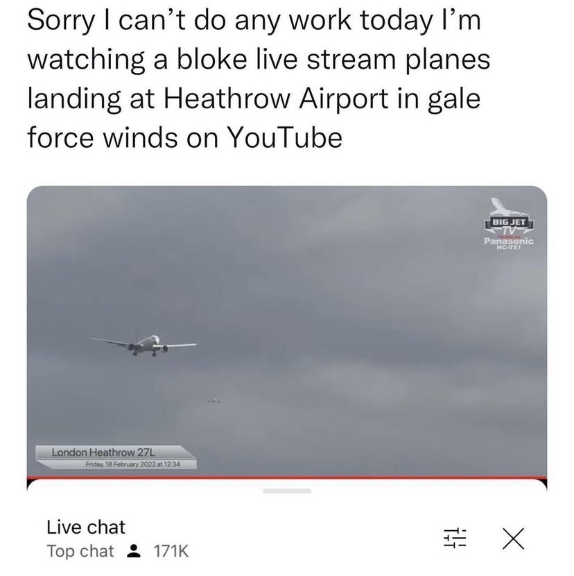 Just stumbled across this channel, live streaming planes trying to land at Heathrow Airport.