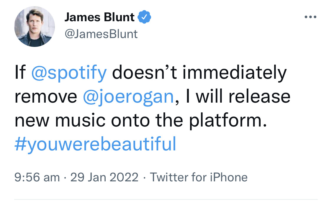 Things could get bad if we get into a Joe Rogan situation. Apparently James Blunt has threatened to release new music onto Spotify if Rogan isn’t banned.