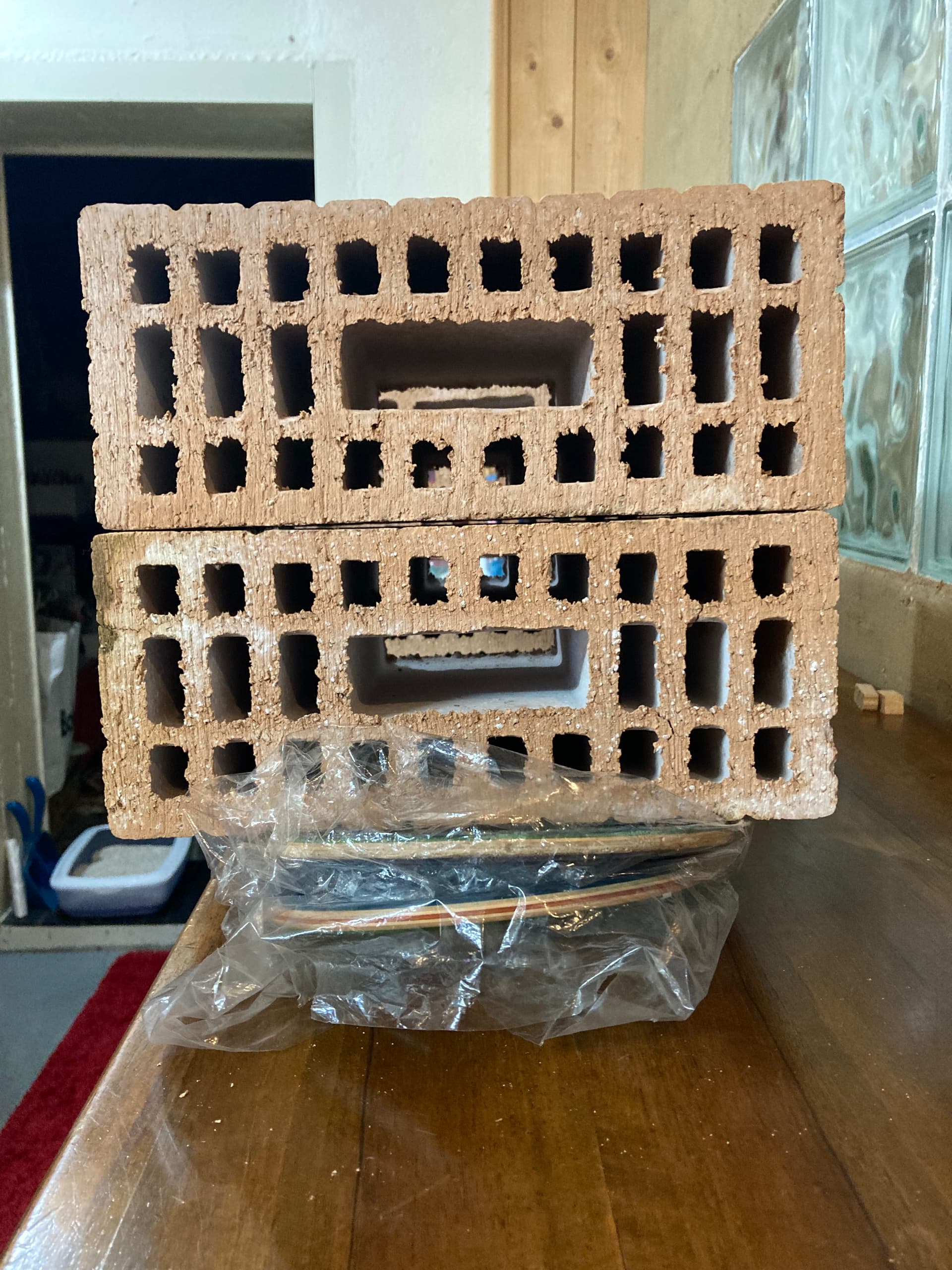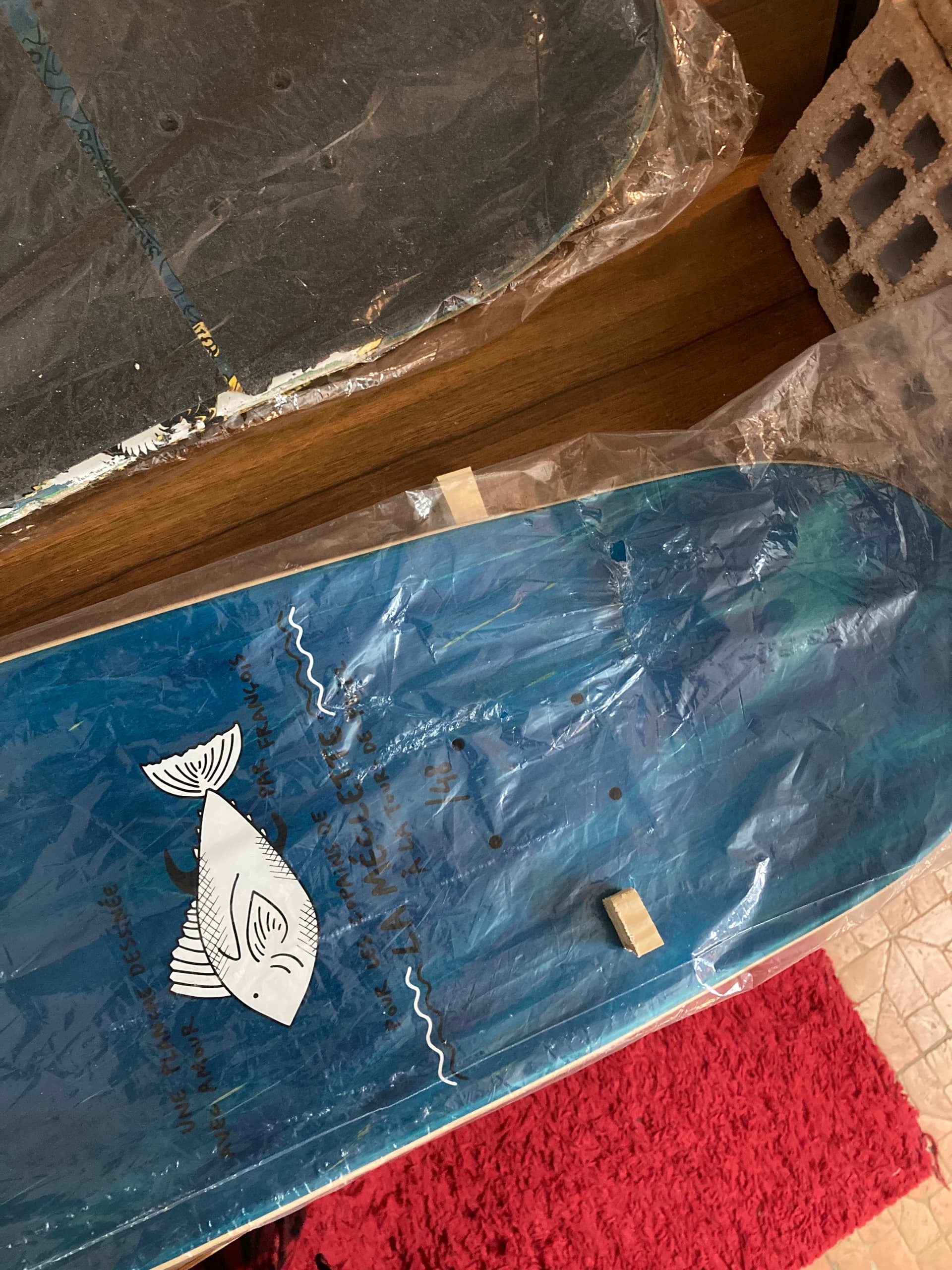 Put two sticks near the kick of your board that’s warped (near the trucks, pretty close to the rail, not like what you see in this picture), one on top, one under the board so it’ll get twisted back to its original shape when you’ll put weight on it later. Sorry if you can’t see that well, I put my boards in shrink wrap so they don’t get trashed. You’ll get the idea.