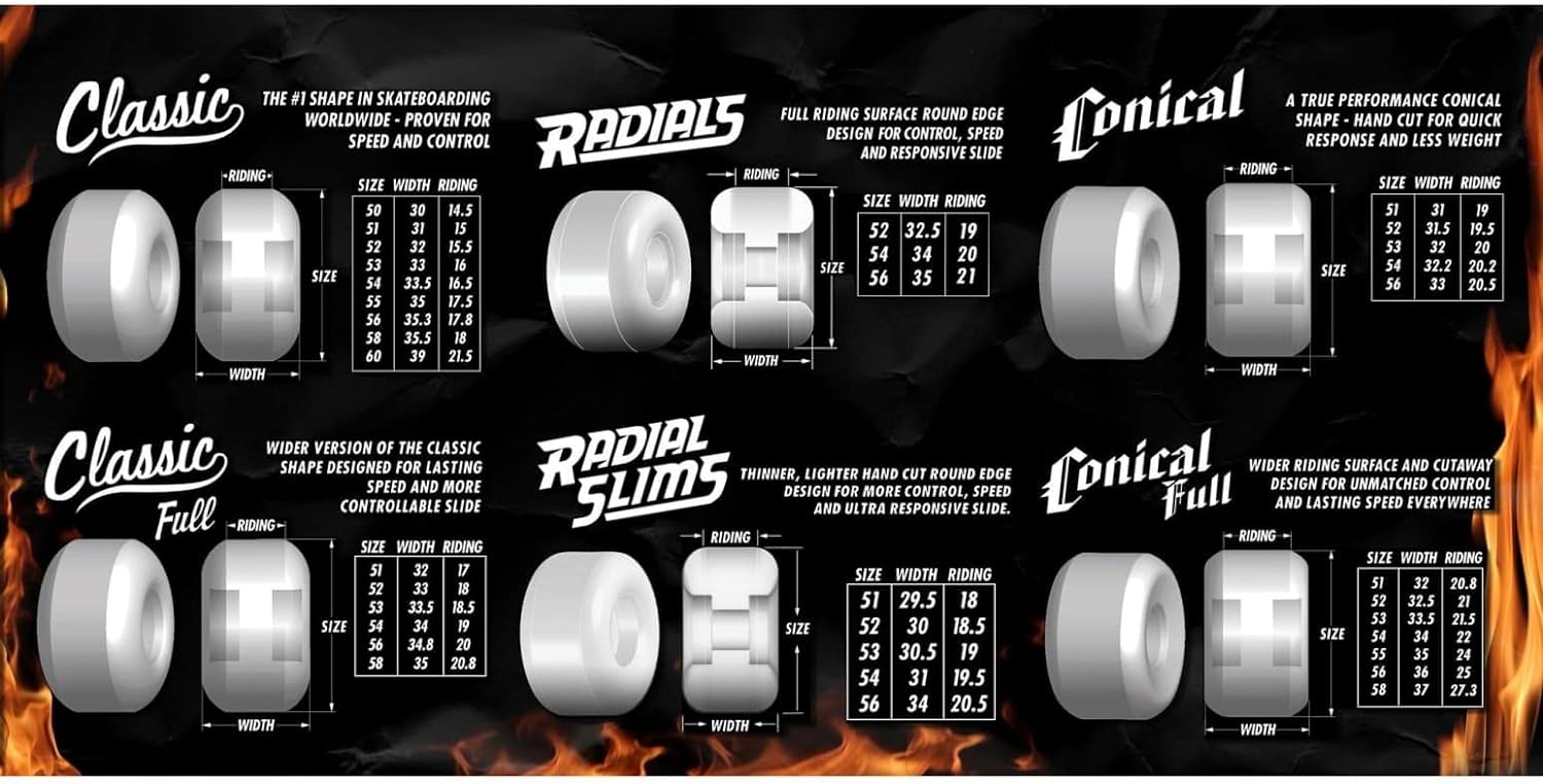 The flat side is supposed to help you lock into grinds. A bigger radius edge is supposed to make rolling into and out of grinds easier. It does make a difference but just going for the middle option gives you the best of both worlds and makes the others a bit redundant.