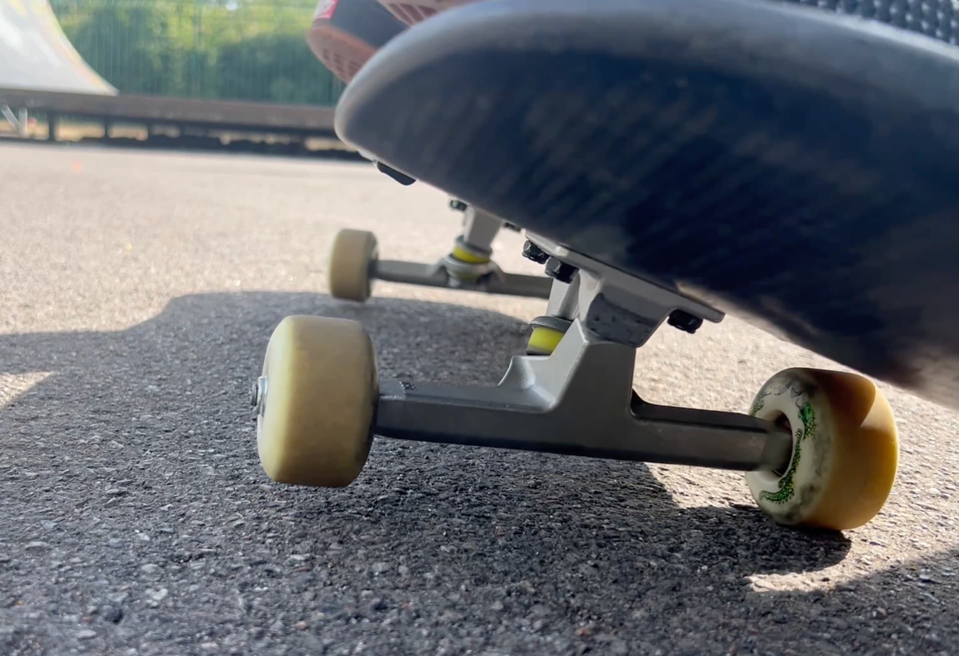 - They have an anti wheelbite feature that means the squared-off pivot block makes contact with the baseplate before your wheel hits the deck - so even if you lean with all your weight you’ll just lift the outside wheel rather than the inside wheel jamming against the bard.