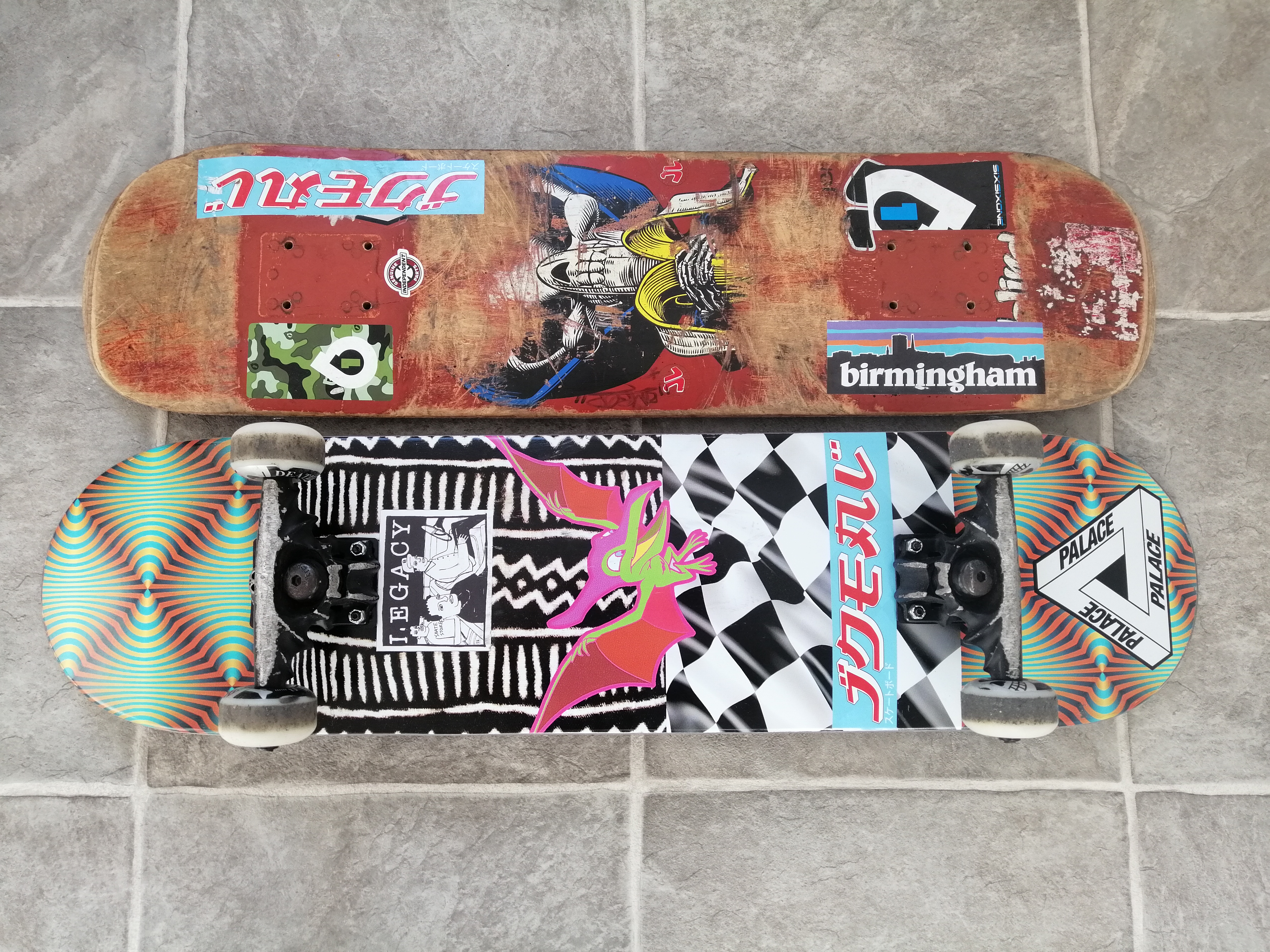 Thought I’d join in. Top is my old Blind deck bought from Florida on holiday in about 2002. Don’t let the scratches fool you. I couldn’t actually grind anything properly, the scratches are just from many failed attempts on kerbs.