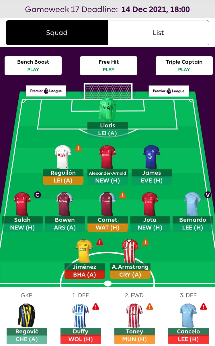 Managed to close the gap on the top 3 despite 2 players scoring 0 and 3 scoring 1 this week. It’s the only mini-league I gained on this week, losing places in the other two I’m in. I don’t feel like I’m going to get any good returns next week either, because of injuries and stuff. Also rumours abound of a Covid outbreak at Spurs, apparently 6 players and 3 staff, so you might want to transfer some of those assets out if you have them.