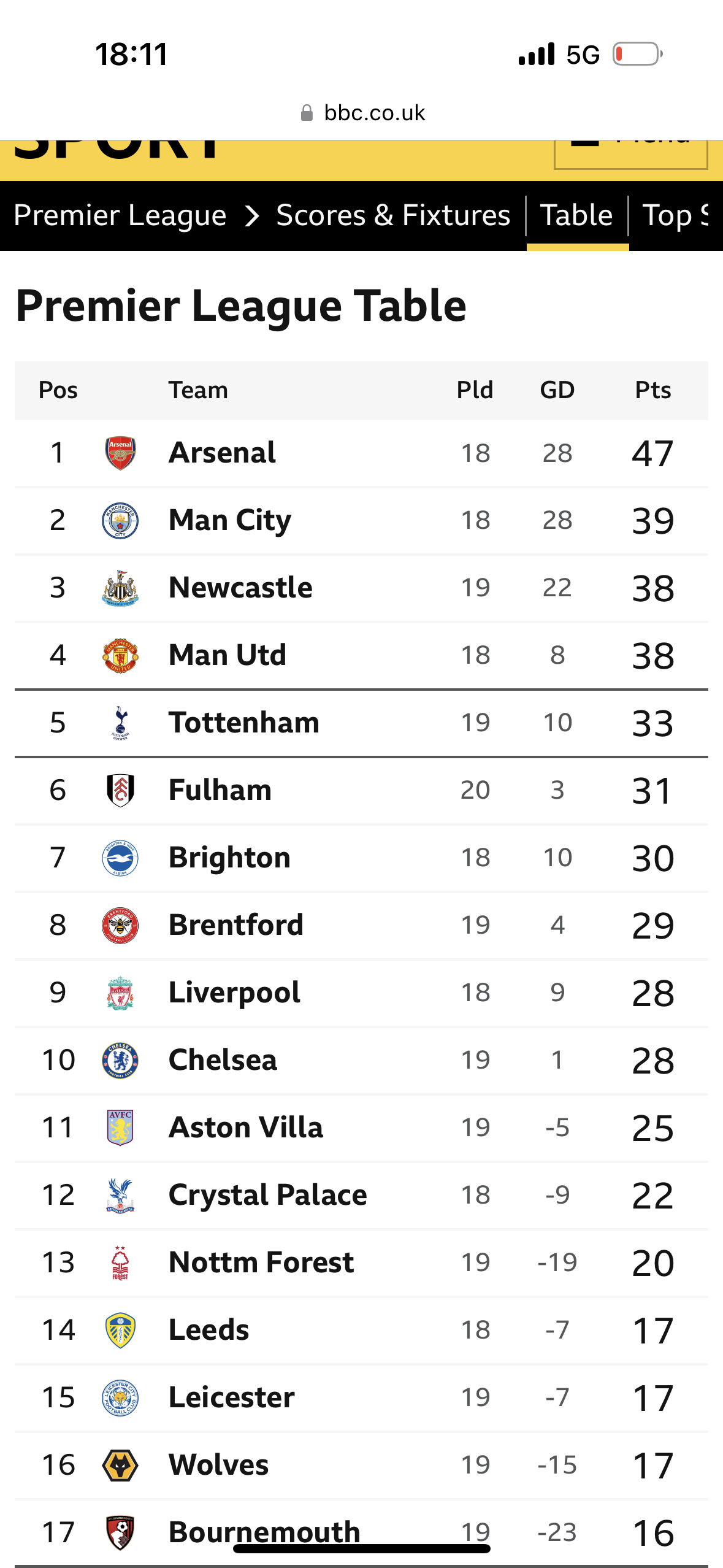 Live table. But 5 points clear of Spurs and both played 19. IF, MASSIVE IF, our form continues like this into mid Feb we have a lot of winnable games then some of the big boys. 4th is not out of the realm of possibility, plus we need to sign a midfielder ASAP.