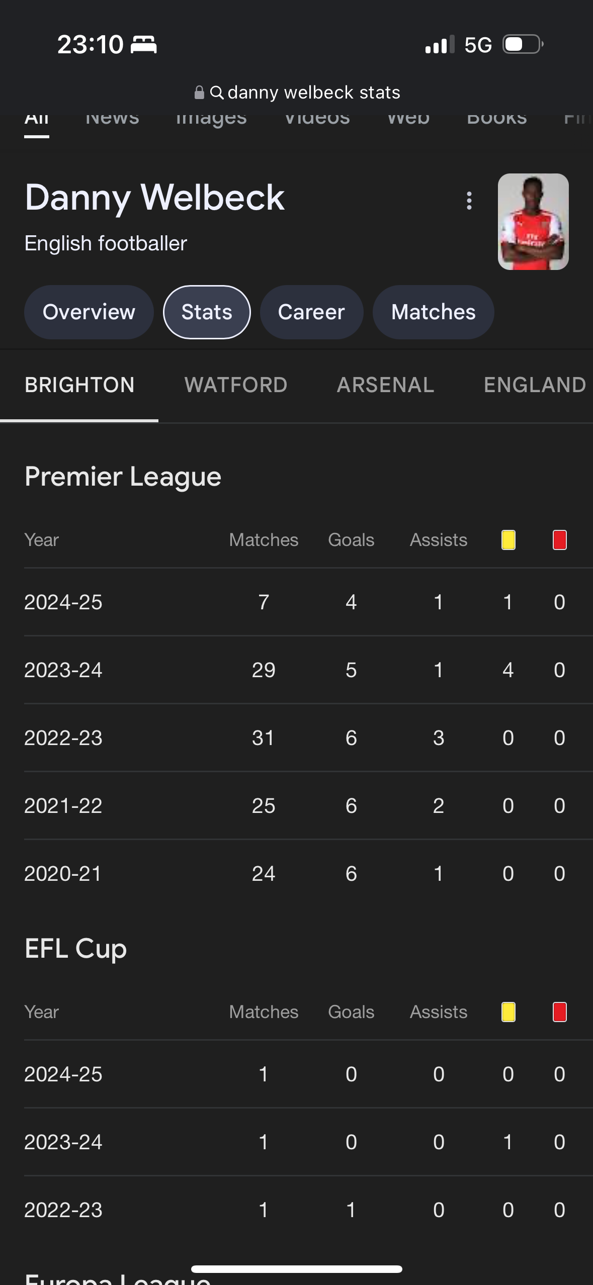 Wellbeck making a cracking start to the season at 33, last time he scored more than 6 EPL goals in a season was 2013/14