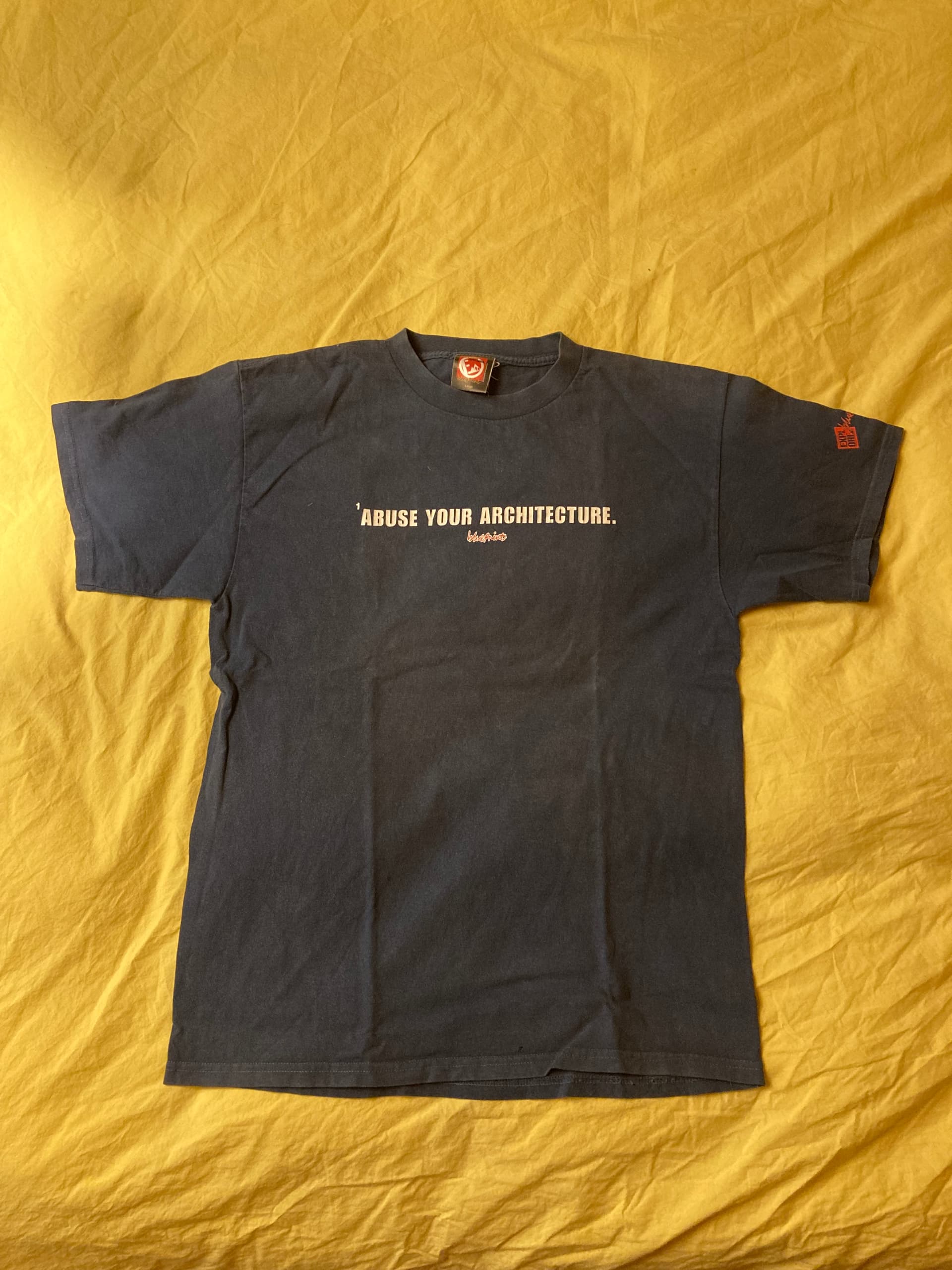 Large Blueprint Abuse Your Architecture tee, blue. The colour is slightly faded but it’s still totally wearable, actually looks vintage in a good way I suppose. No holes or anything. Yours if you’re ok with paying P&P from Switzerland (should cost between a fiver and a tenner, I don’t know exactly). PayPal preferred. I can send you pictures and measure it if you want, I just want it to go to a good home and thought some of you on here might be into it.