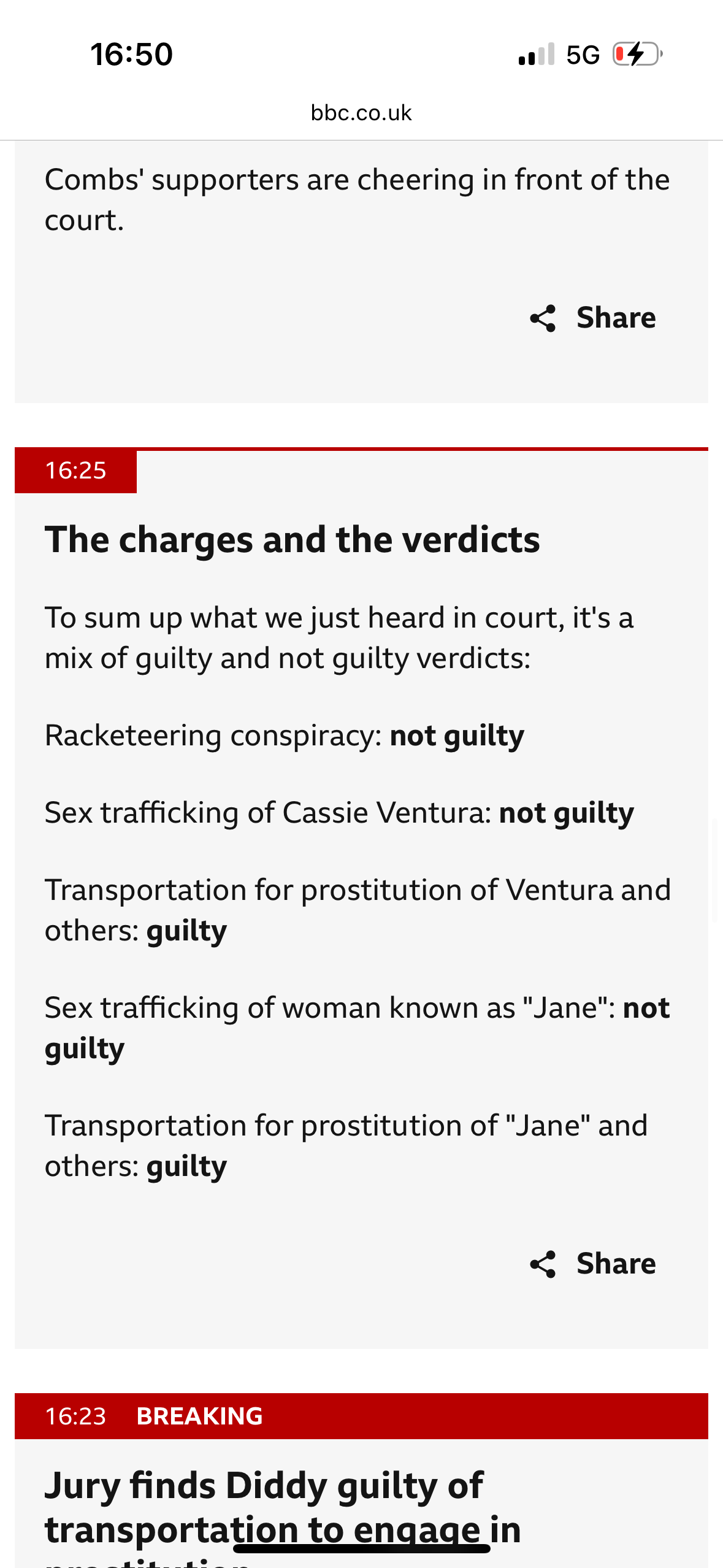 Sean Combs found not guilty of the most serious charges. Wtf - maximum 20 years but clearly he wonât get that.