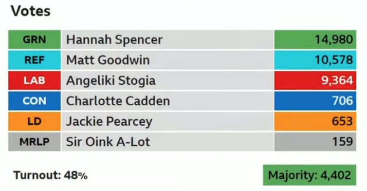 Tories only got 706 votes, Sir Oink A-Lot got 159! Still worryingly high for Reform. Just a 48% turn out too.