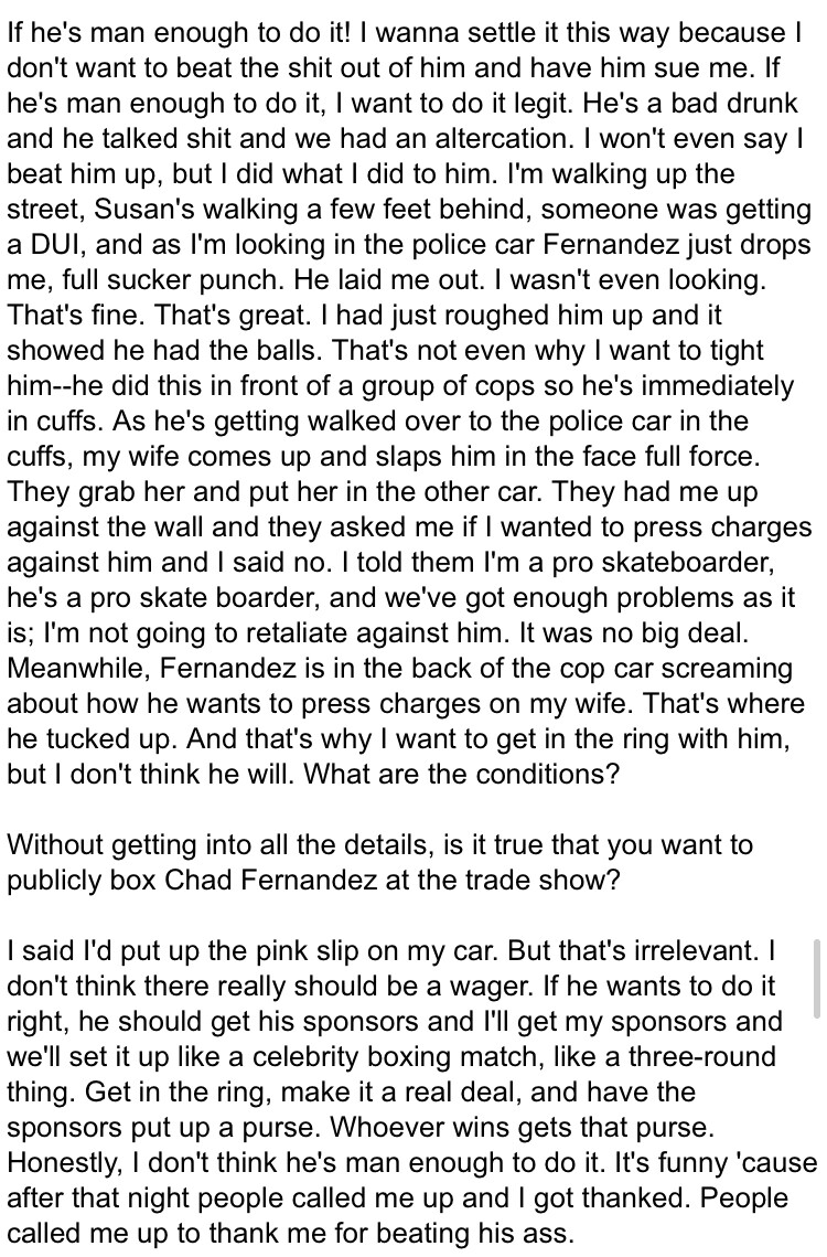He was meant to have an organised fight with kris Markovich. I believe something to do with sleeping with Markovich’s then wife. I’m sure I read about that in an interview with one of them in Transworld or another mag… or am I imagining/mixing two different tales up here??