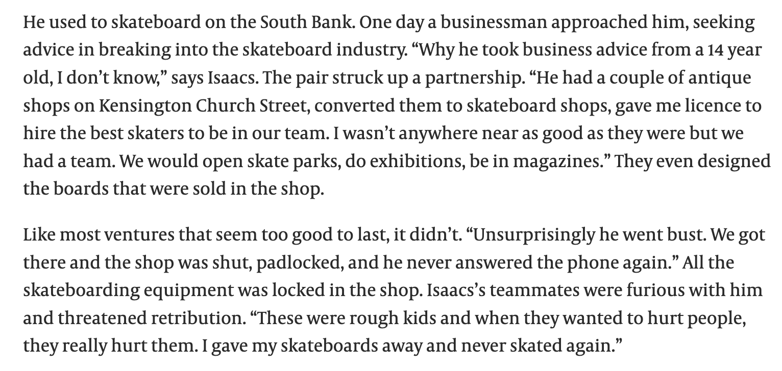 I went pretty heavily all-in doing the London Calling zine a couple of years ago (a 72-page magazine all about UK - although mostly London - skateboarding during that time) and I’ve never heard of him. A quick CMD+F tells me nobody I spoke to for that mentioned him either.