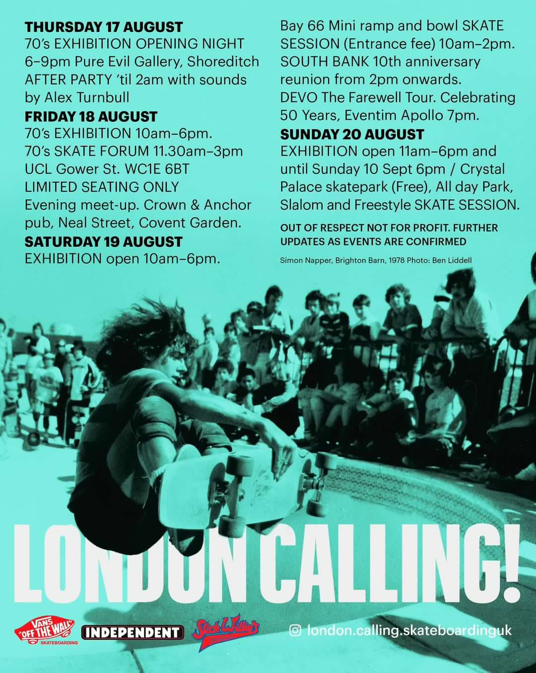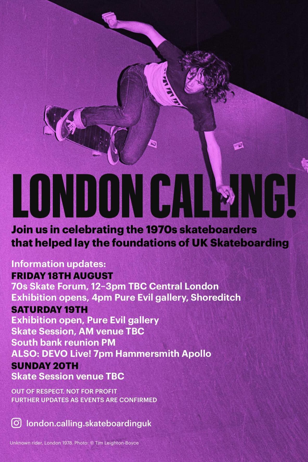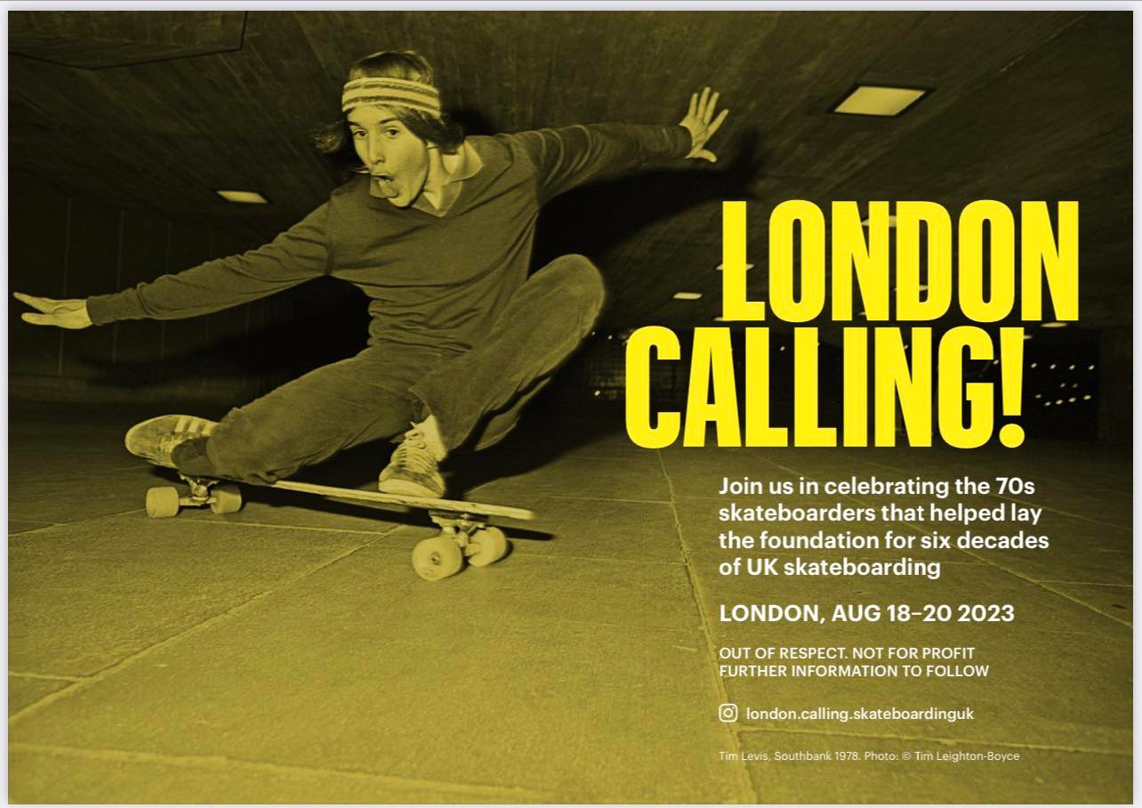 LONDON CALLING! This year……is a tribute to show respect to those 1970s UK based skateboarders that laid the foundations for arguably the best and most influential skate scene outside California. Those 1970s riders were an inspiration to many across the UK and around the world.