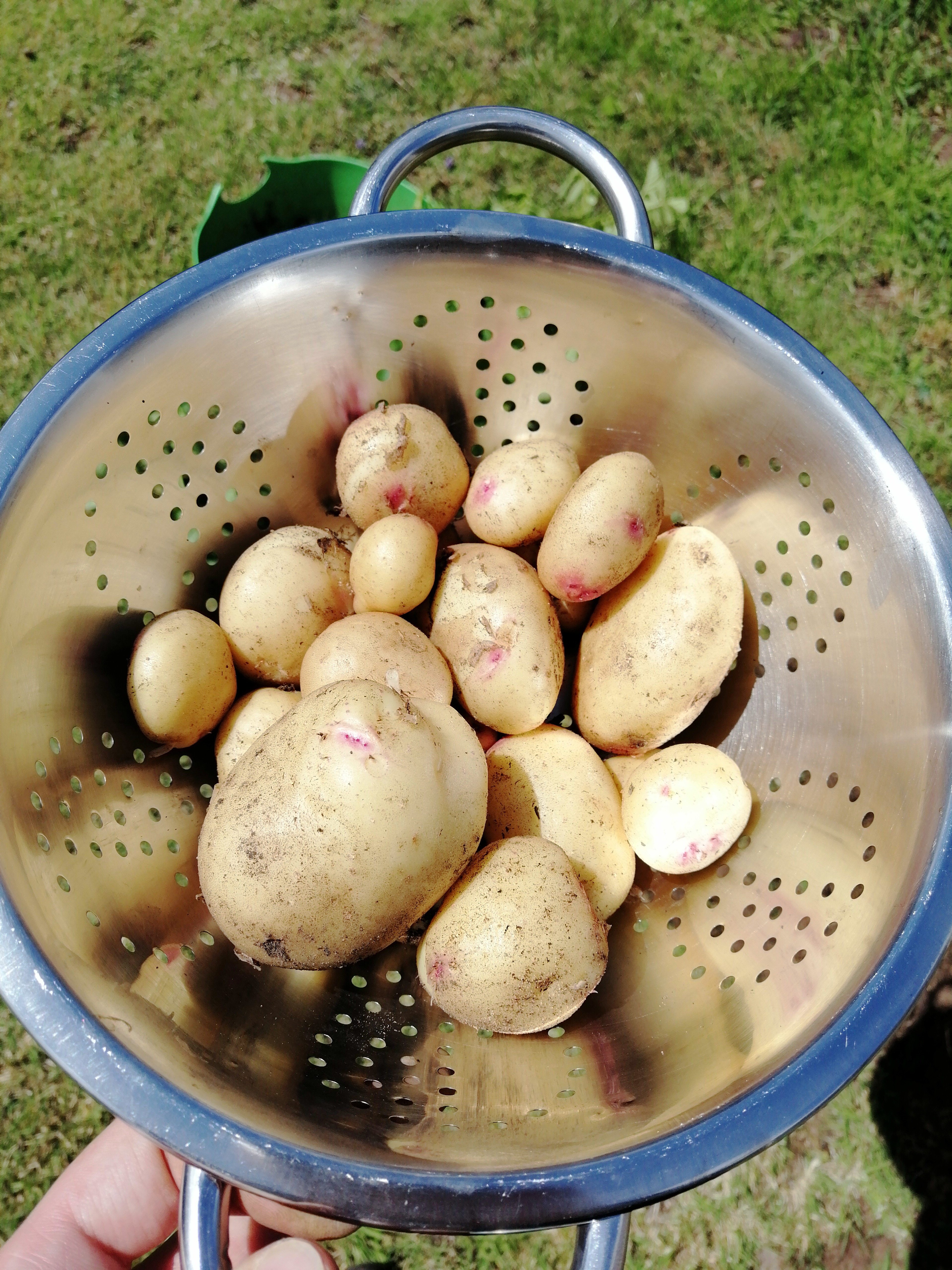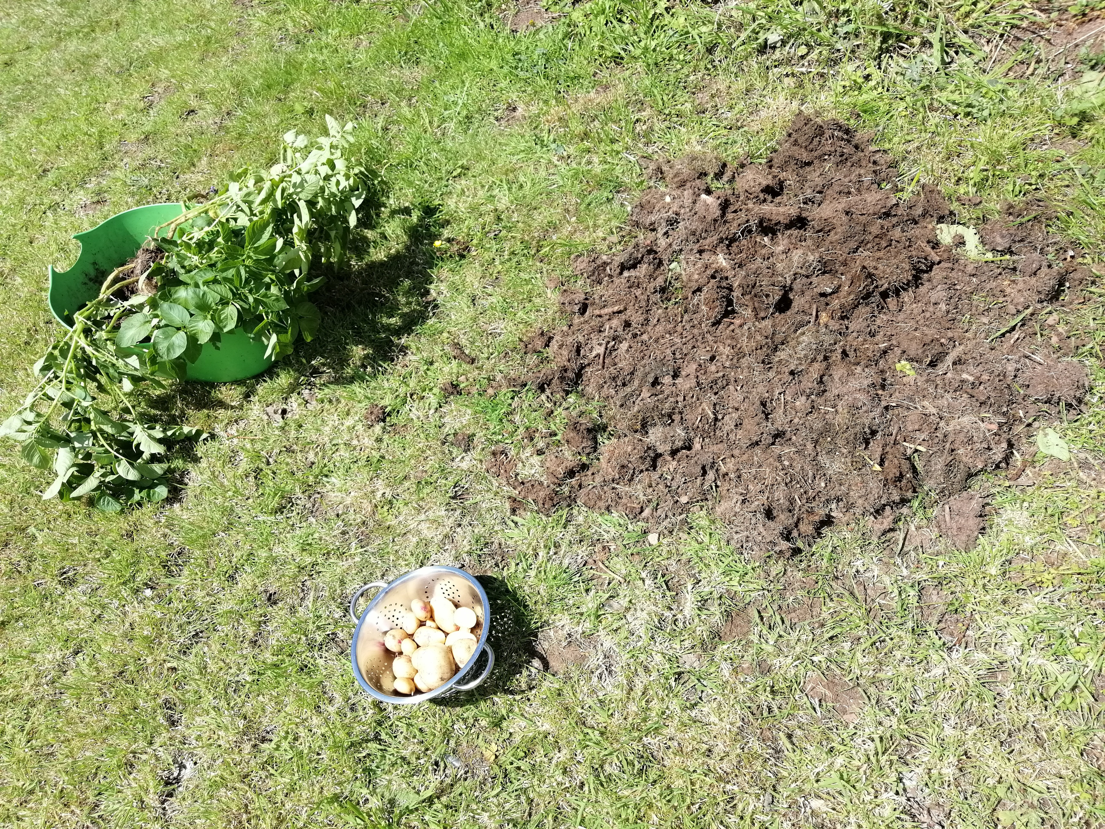 Decided to tip the spuds out and see what’s what. Turned out alright for a first attempt. In hindsight I probably packed too many plants into such a small container. Next time I’ll probably space them out in a larger tub/container/dustbin/whatever, and leave them a bit longer before tipping them out.
