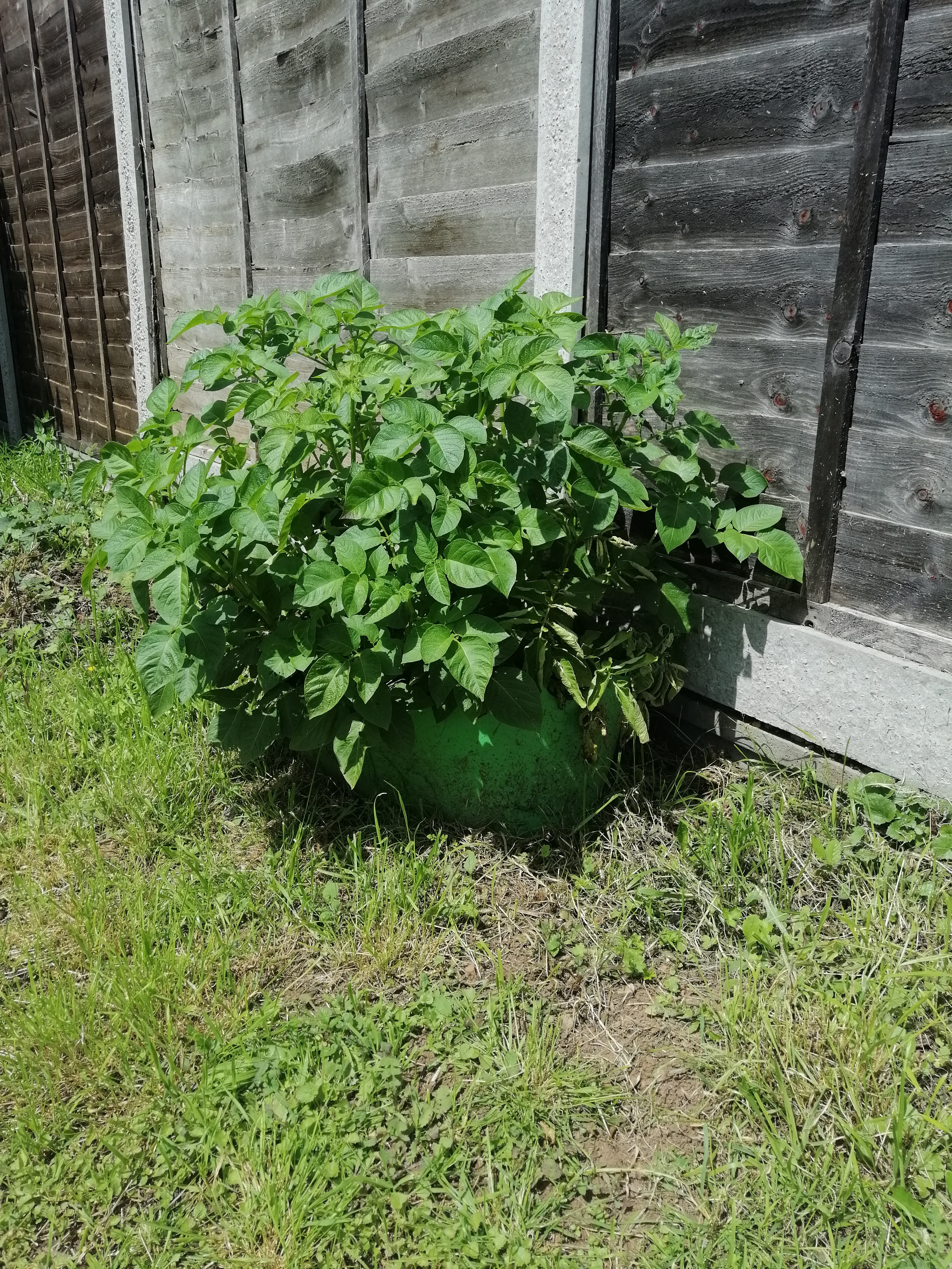 Second picture is my first ever attempt at growing potatoes. Didn’t cost me anything. Used an old washing basket with broken handles, drilled loads of holes in the bottom. Used compost from last year’s grass and bush cuttings. ‘Hilled’ them up twice. Grown the potatoes from supermarket potatoes that started to sprout. I’ve heard that sprouting supermarket potatoes don’t always grow properly, so we’ll see how well they turn out. I’m not too bothered considering they cost me nothing except a bit of time and effort.