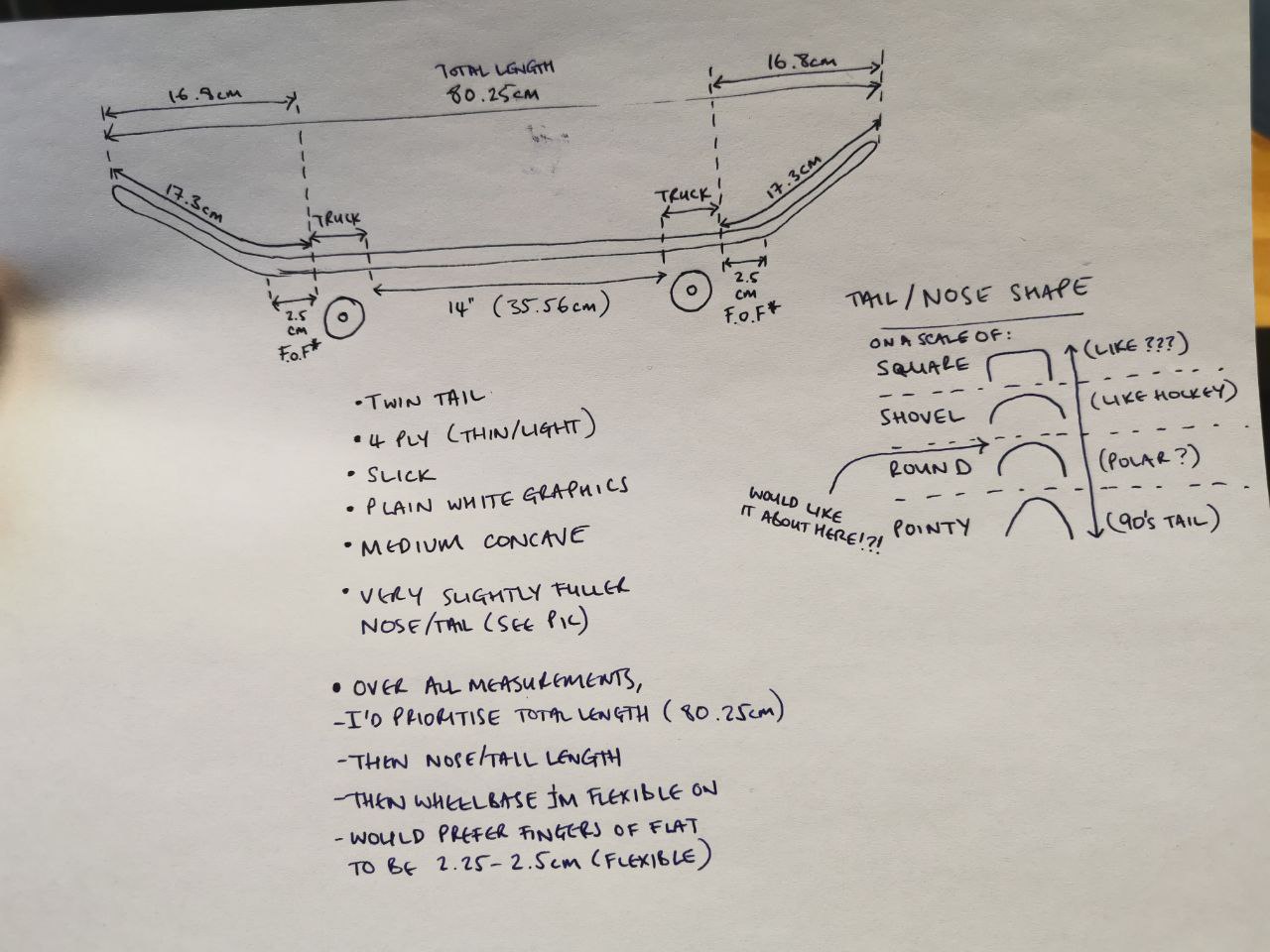 Board will be 4 ply, slick. Apparently super light and strong, thinner, obvs and with super pop. This is what I gave him: