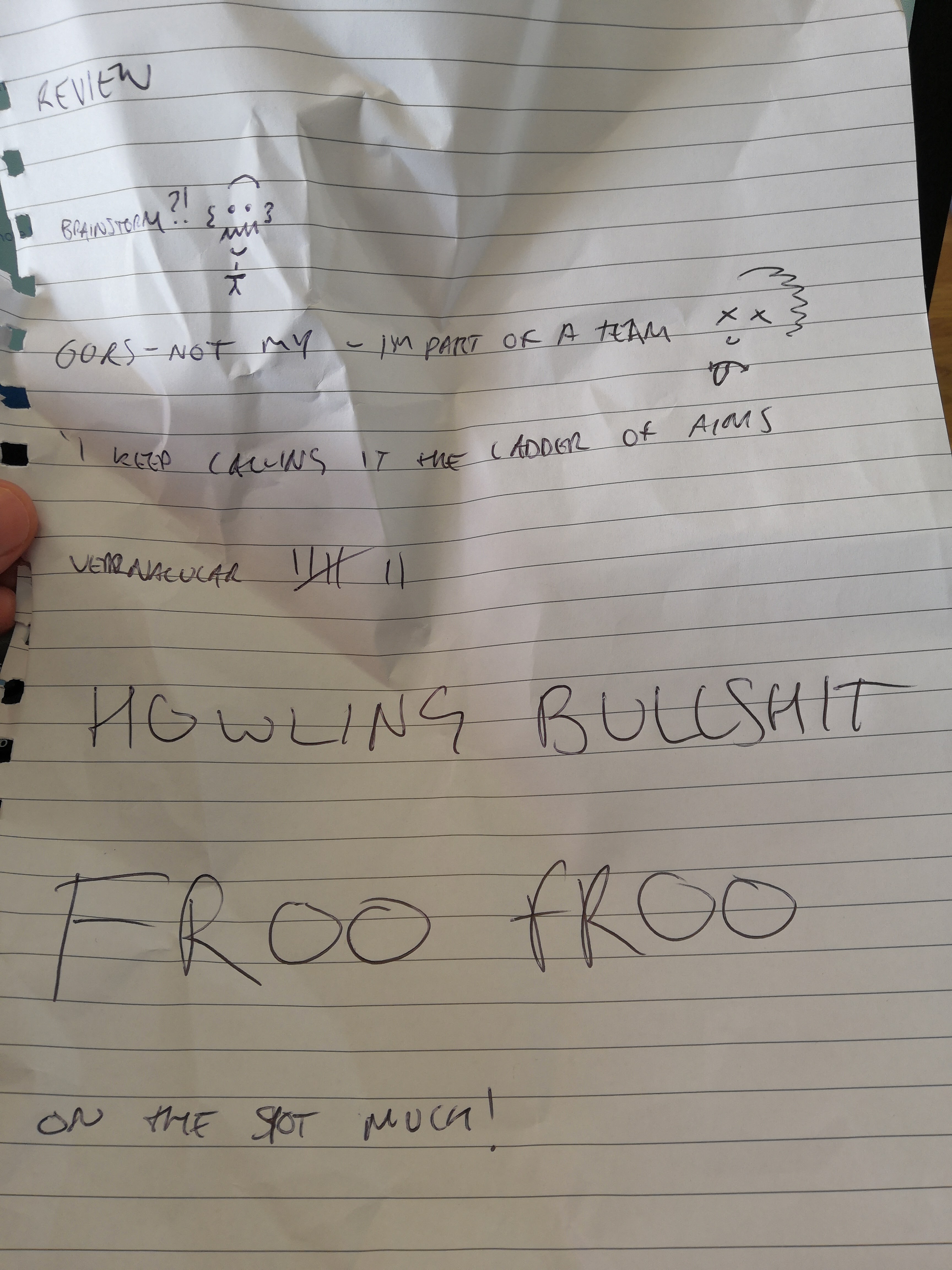 The new owner the company. Fucking hell. I’m embarrassed to hear him talk because I really didn’t think people like this existed. These are the stream of consciousness notes I took from our last ‘meeting’ last week.
