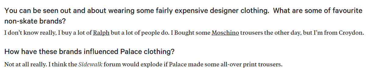 What Palace do with their clothes doesn’t bother me, if they do a collab with gucci why not. Isn’t it just cool to think that it’s mad they can pull off a collab with Gucci. How does that sort of thing even come about?