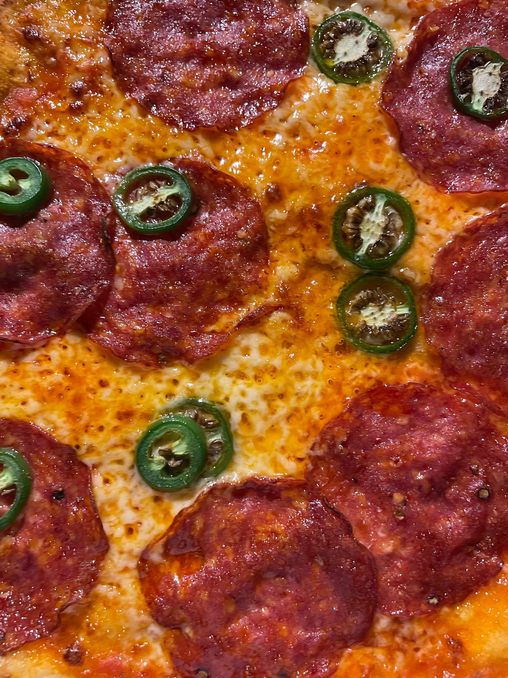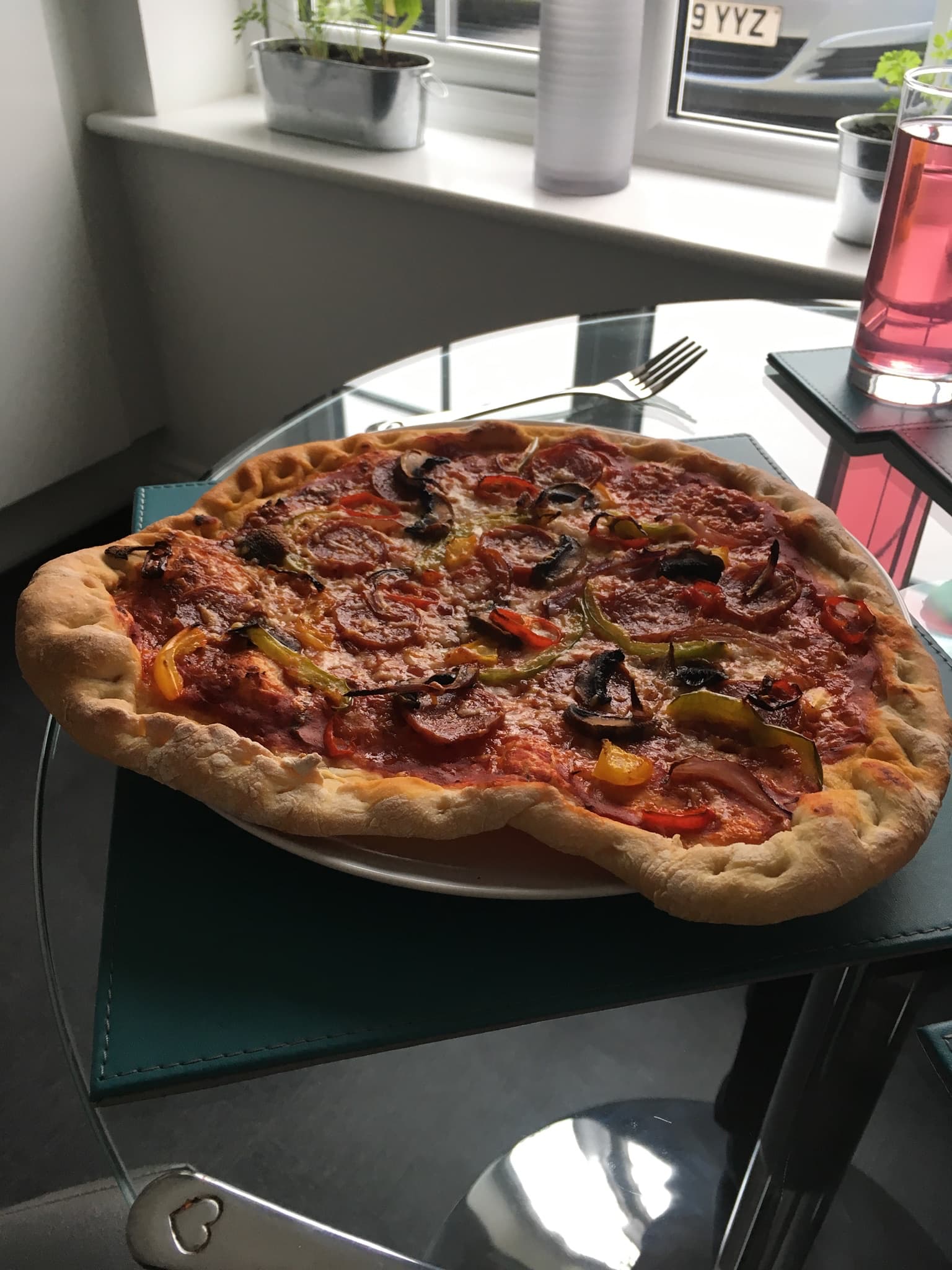 This is my effort at homemade pizza. Went for pepperoni, peppers, onion and mushroom as toppings (besides cheese - cheddar and mozzarella mix like the absolute heathen I am).