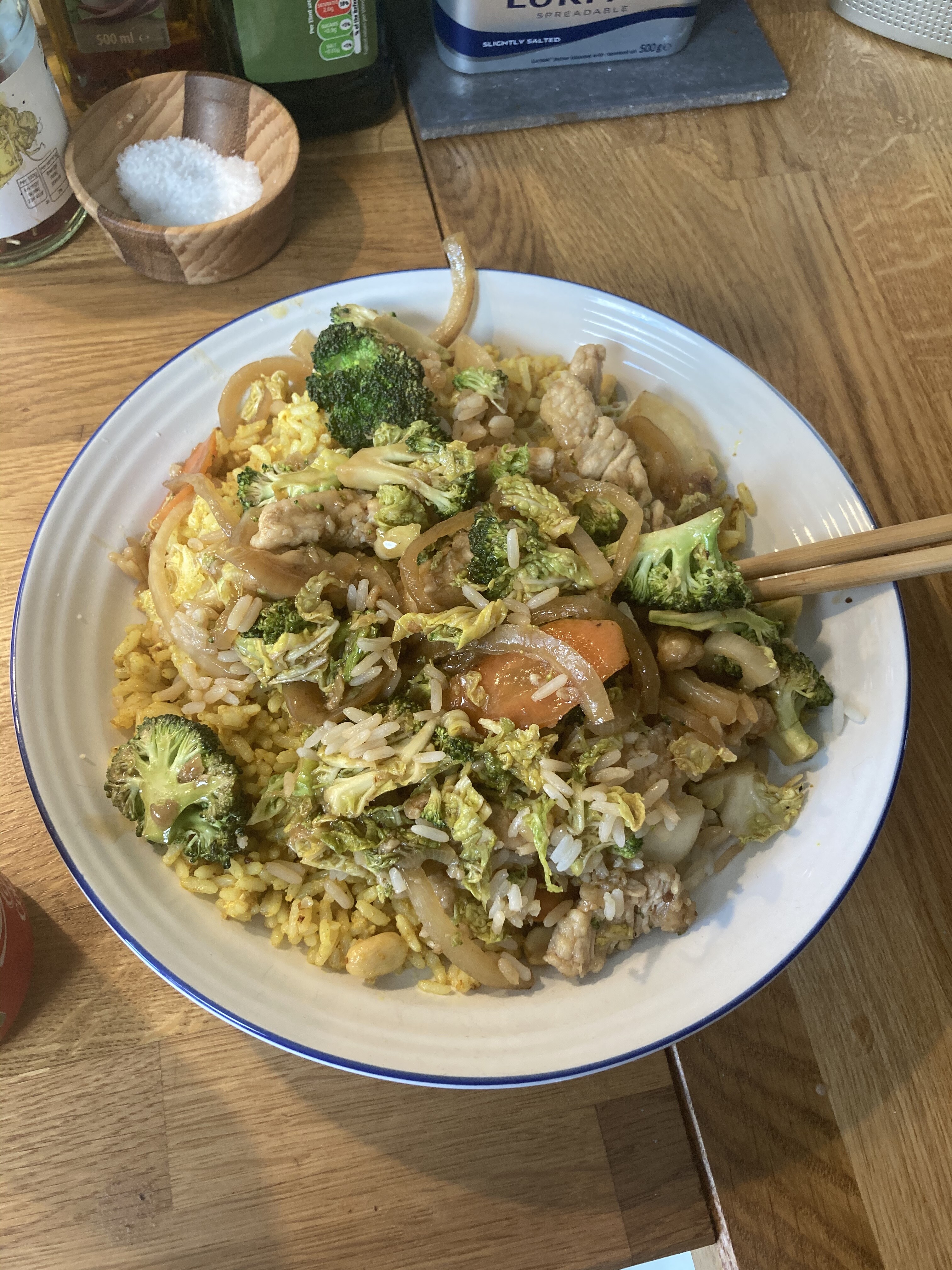 Get some Jimmys Satay sauce because its the greatest thing ever. Stir it into some rice as youre frying it, bit of turmeric, handful of peanuts right at the end and youre laughing.