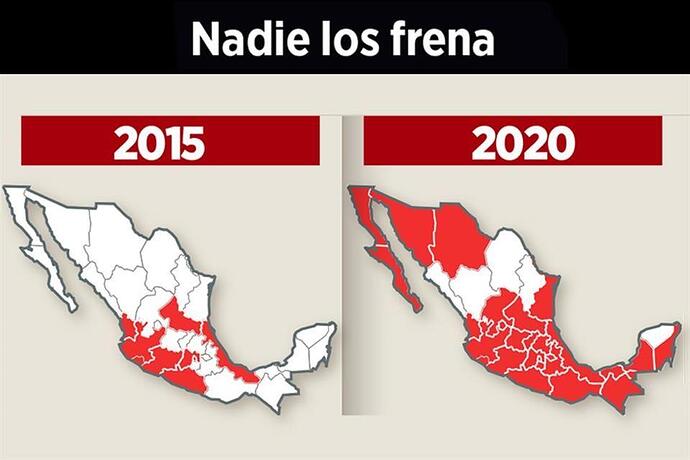 But there’s a somewhat less prosaic element to the avocado thing which is arguably more important than just locations. So, for the purpose of the map you see above, it was created with info from ~ five years ago when Sinaloa (pink/red areas) were the main guys in charge. Now, CJNG are the cartel who are basically taking the entire country. This is what Mexico is like now (below) - they are the red regions: