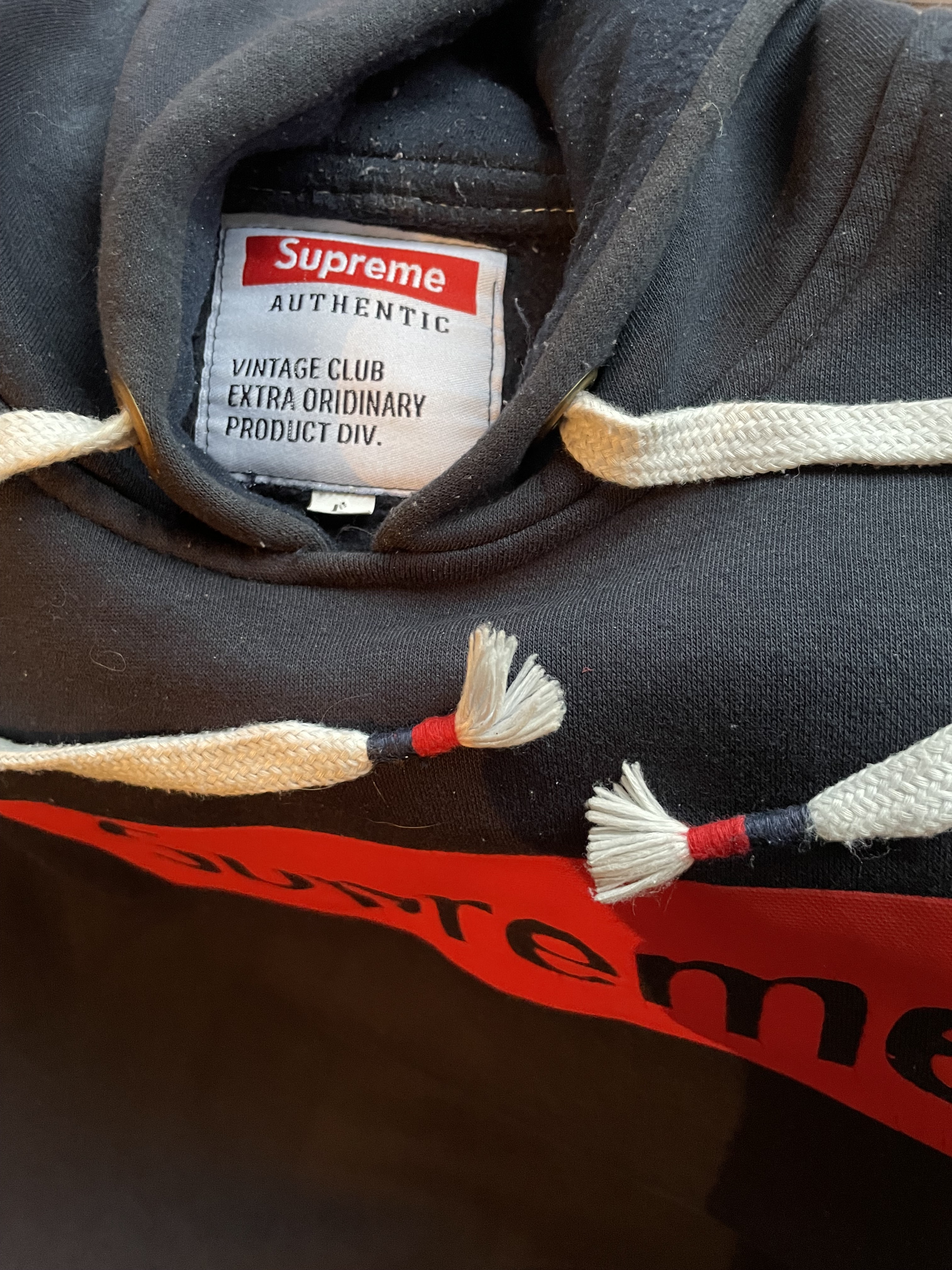 I think he means the box logo on the label, which isn’t quite as outrageously ridiculous as the one on the front, which yeah, is a very long way off. Then the drawstrings, and cut of the neckline, the weight and weave of the cotton etc. etc.