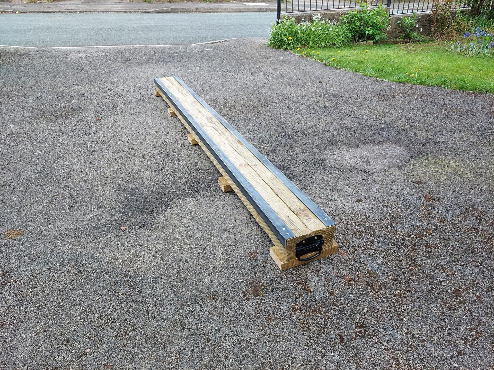 I’d say 15 centimetres high would be ideal for me, 2 metres being a good length but too long to fit in a car. Make it as long as you can and yes, put angle irons on the long edges.