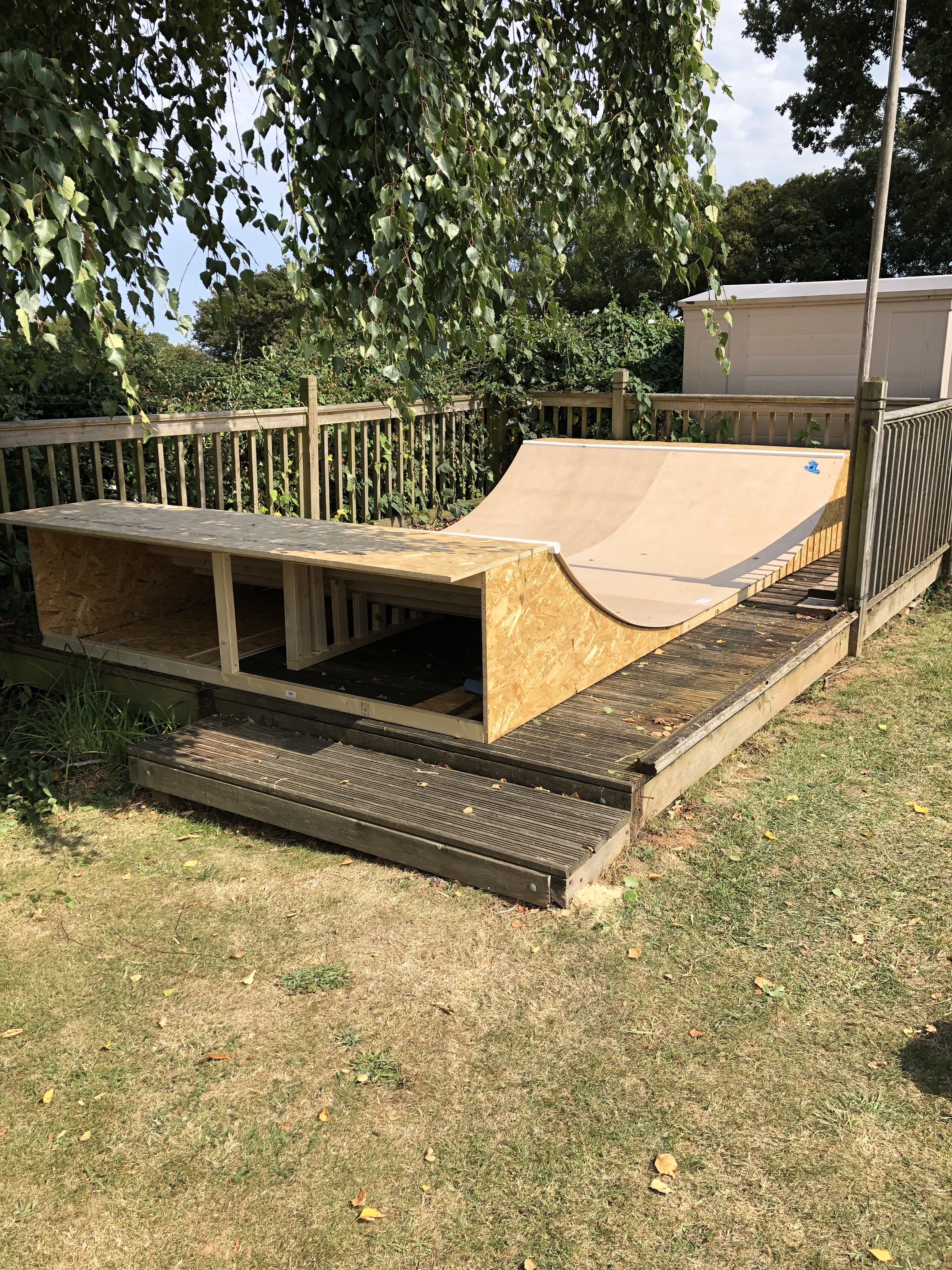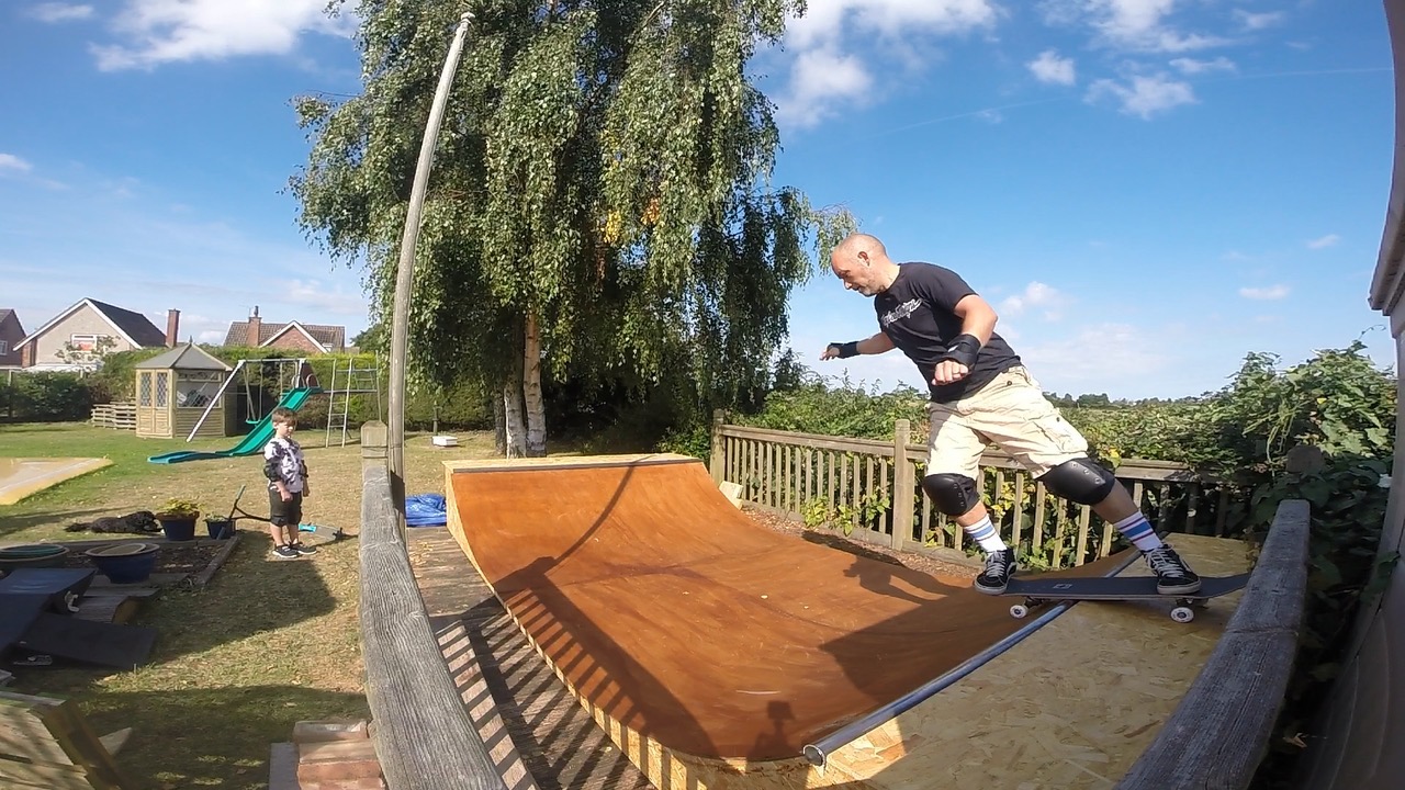 I’ve also replaced the plastic coping with 2” mild steel. Wanted 2 and 3/8 but the local iron mongers didn’t have that size. Works well though. Need to fettle with the position as I’ve got a bit of a gap between the ramp and coping but it’s only cosmetic. Makes no difference to the actual use; no wheel bite. Enough height for the rails and trucks to connect and the diameter makes grinds, slides and stalls stable. I’m waiting to hear back about a local wood supplier that has a special on WBP sheet plywood. Apparently this stuff is ‘weather boil proof’ using waterproof glue for the veneers same a marine but as it can have voids or knots so it’s much cheaper than marine grade. This supplier had it for sale previously at slightly less than the cost of standard sheet at places like wickes / b&q. So I’m thinking of putting a thinner sheet over what I have and add a coat of stain.