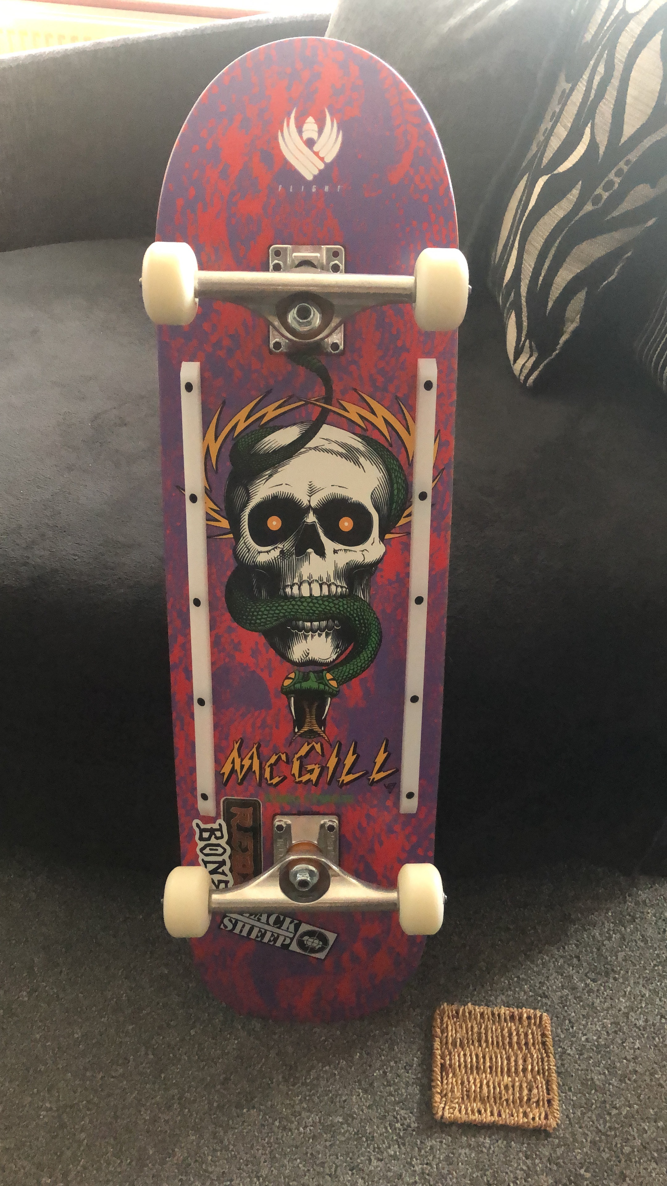 Well I worked out, other than rolling round on longboards a bit over the past couple of years, I had basically started to become old. I stopped skating ‘proper’ at 17 which looking back was a shame as there’s nothing like it. Between peer pressure, being told to grow up, get a job and it not being seen as a sport I moved to mtb and surfing. So roll forward 28yrs, loose 3 stone in weight and install a pacemaker you kinda realise you only get one go round in life. So the regret of stopping ‘stopped’ and the need to enjoy skating, and be healthy with my kids, kicked in. Plan now is to ride this as it is then in spring I’m going to move the shed out the way, increase the deck so I can stretch the ramp and increase the flat section from 4ft to 8ft and widen the ramp to 12ft. So it’ll be 2ft x 12ft x 20ft. Probably widen the platforms as well to 4ft each end (for manuals). I’m riding a McGill flight deck (with OG graphics) Indy’s, Powell rib bones shod on 53mm v4 bones. My first board was a McGill so it had to be done!