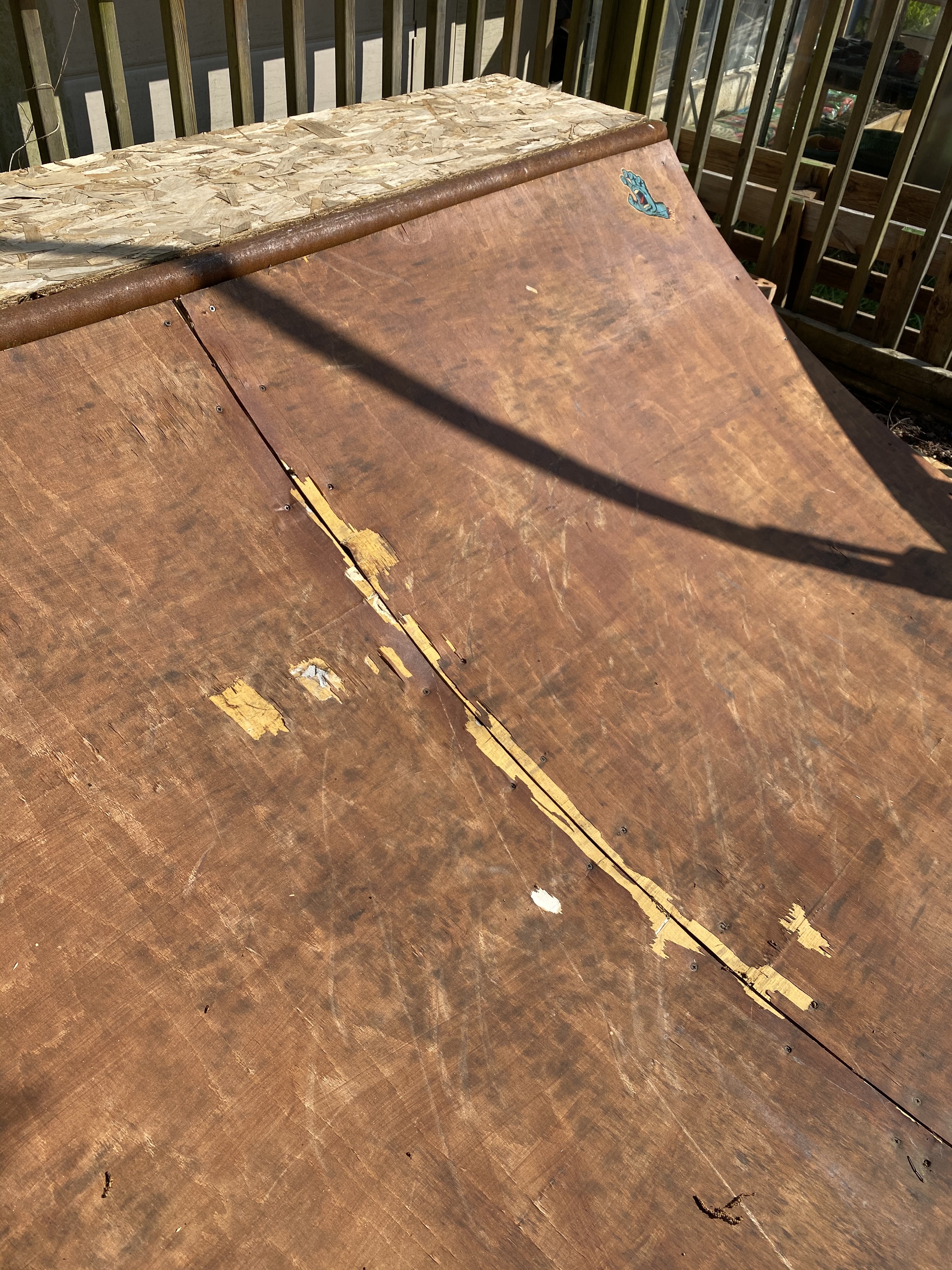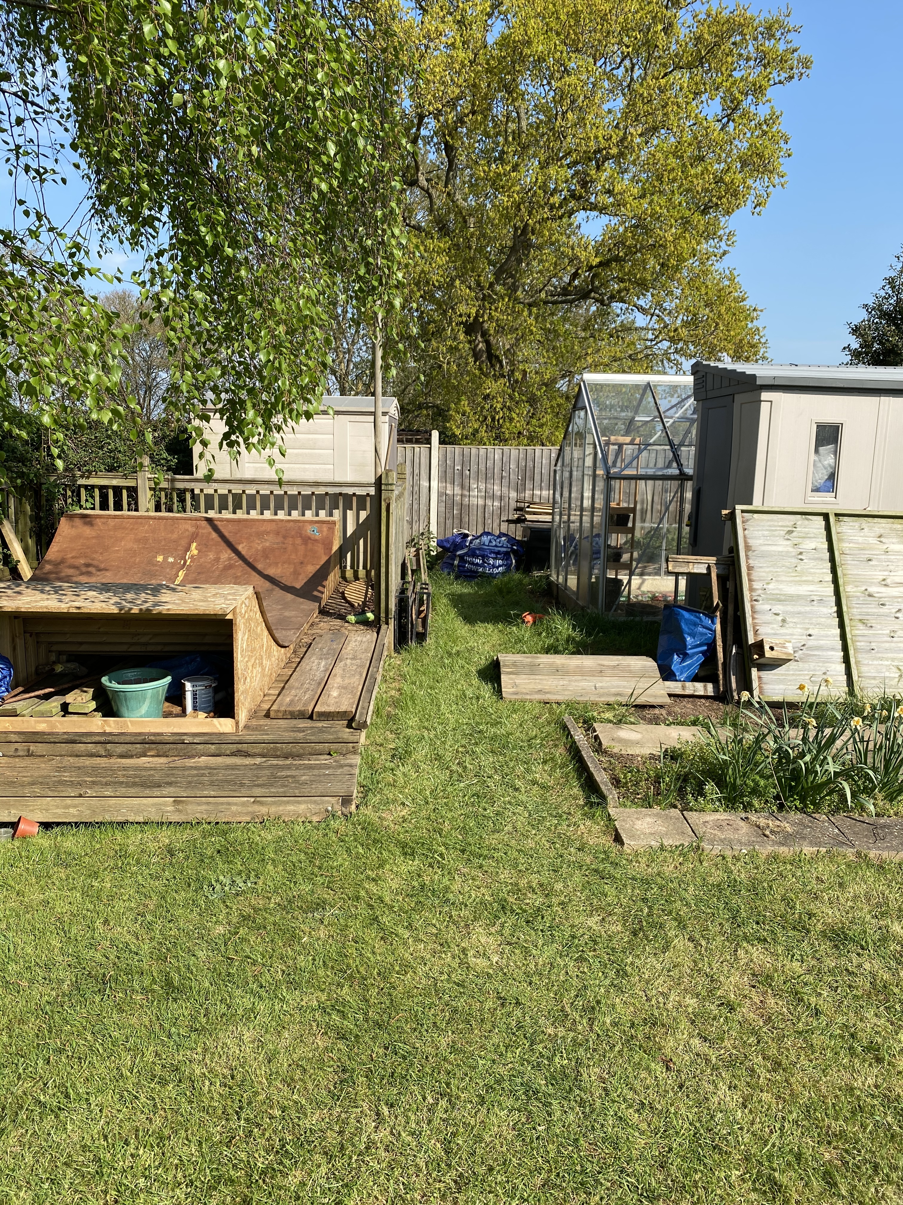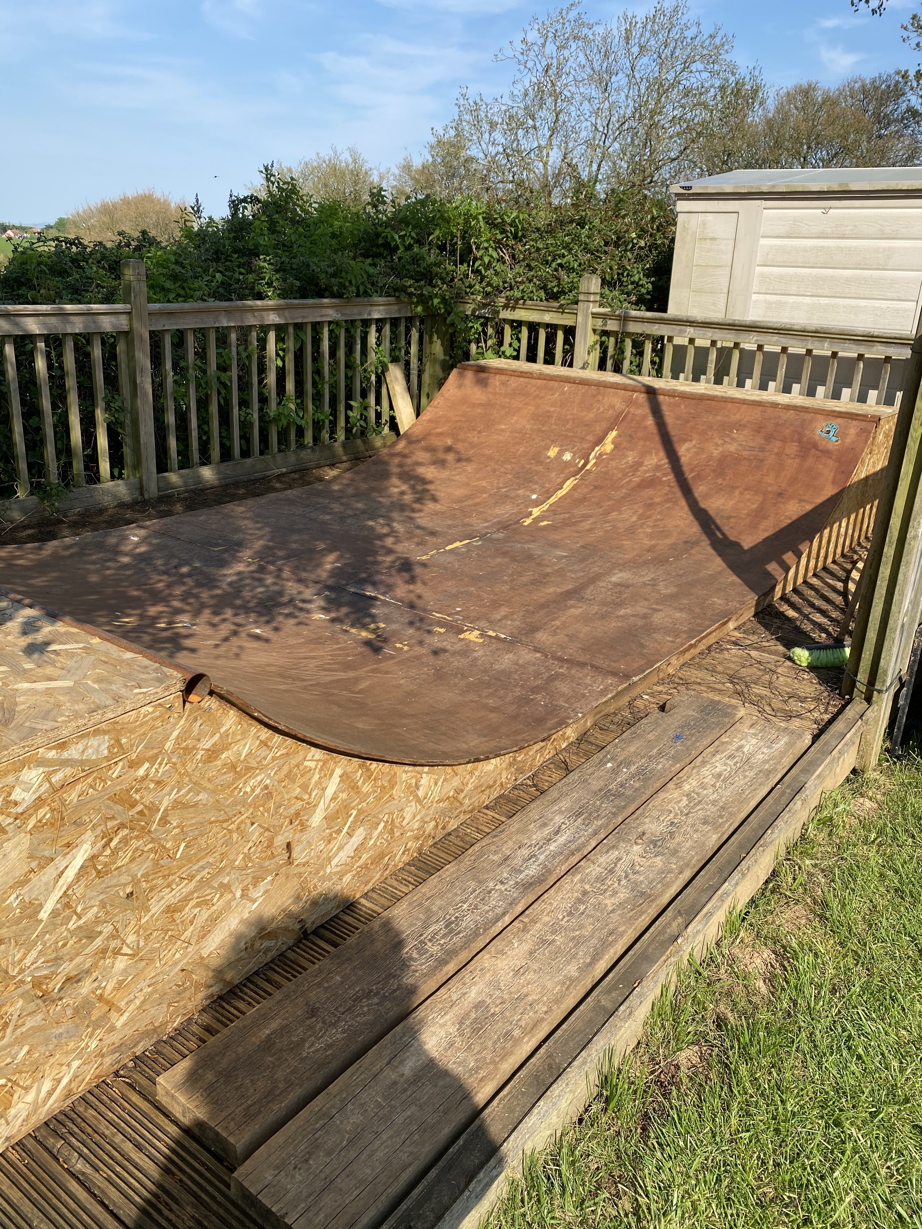 Hi all! Where did that time go. Well I figured an update to be in order. Weather here is awesome (for a change) so we’ve been riding it quite a bit. It held up over the worst of the winter although the top layer does have some de-lamination it not a show stopper. Remember the ramp was built for roughly £300 all in. The cheap tarp did it’s job and protected it when the weather was at its worst ‘but’ it does kind of lock in the wet so took longer to dry. Double edged sword but I think it was better with the tarp than it might’ve been without. Started to begin moving some shed stuff about so once i the big one shifted the ramp will be made longer. I’ve worked out I can double it’s width too so that the plan. 16ft wide, 2ft high and at 20ft from deck to deck. Just depends how big a deck I can add each end. Once I got it lengthened we can look to build a copy of it next to the original one. Will be covering the current one, once extended in length, with wbp board. The new one will be built using the same wood as before as it was cheap, works and dries easily.
