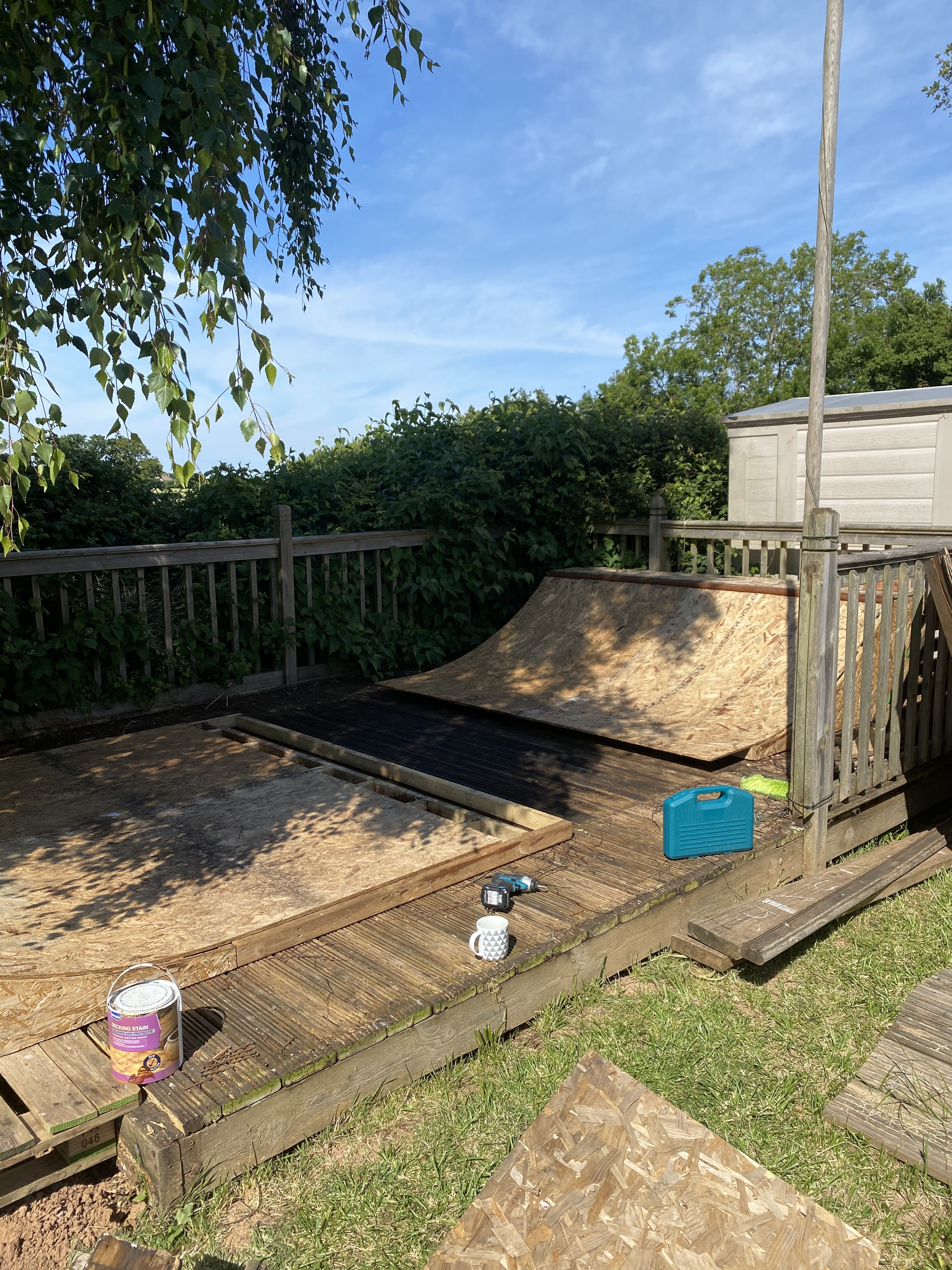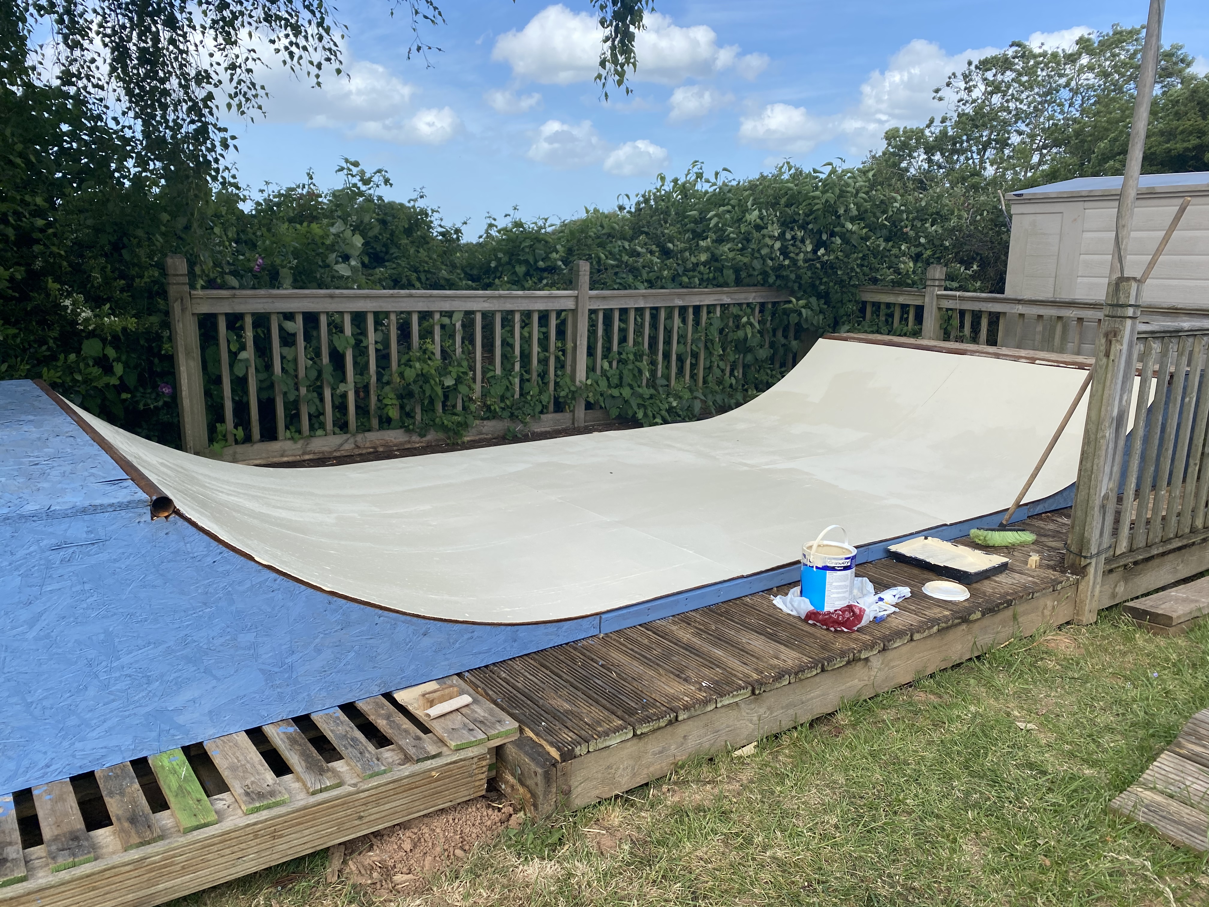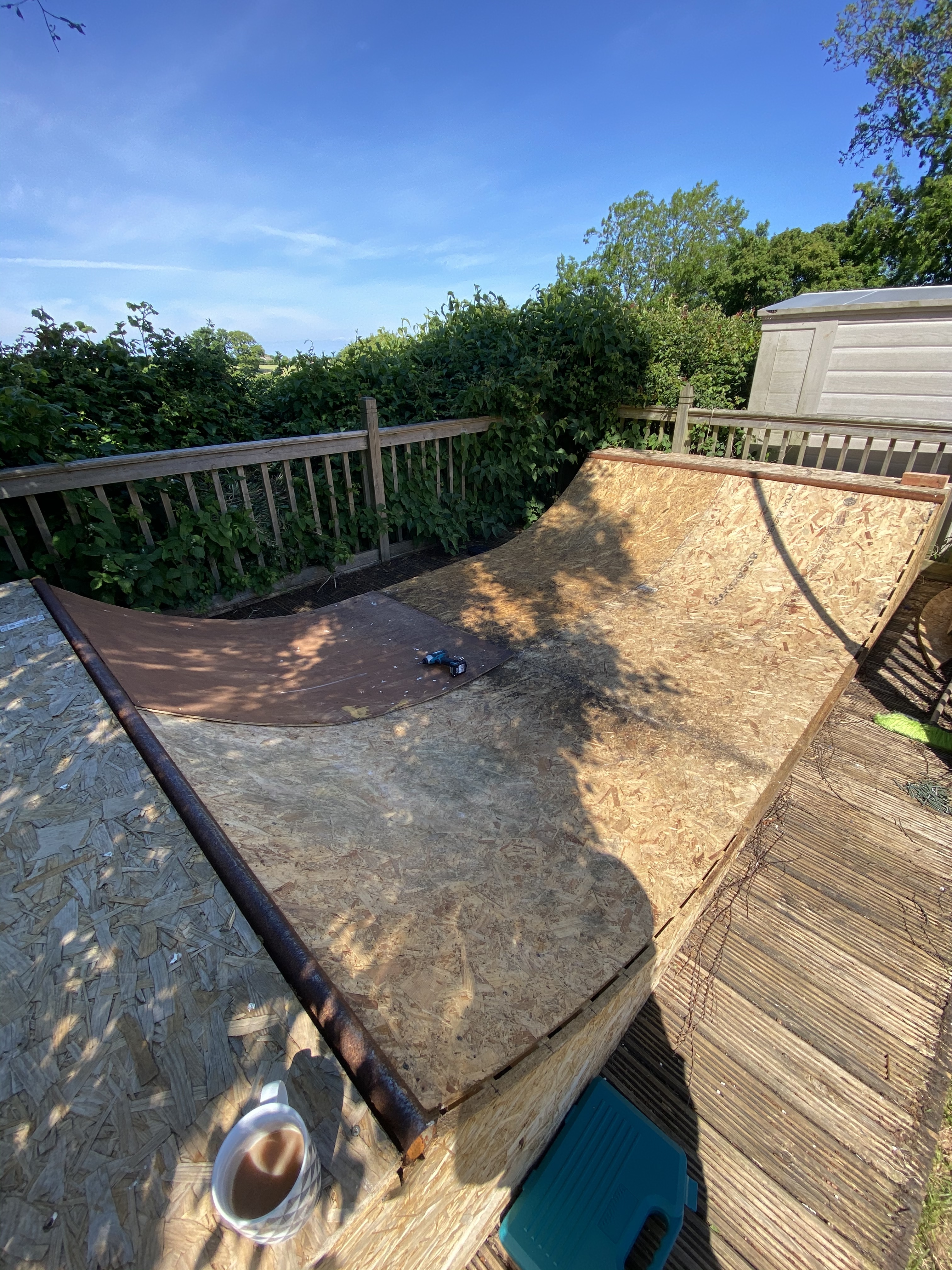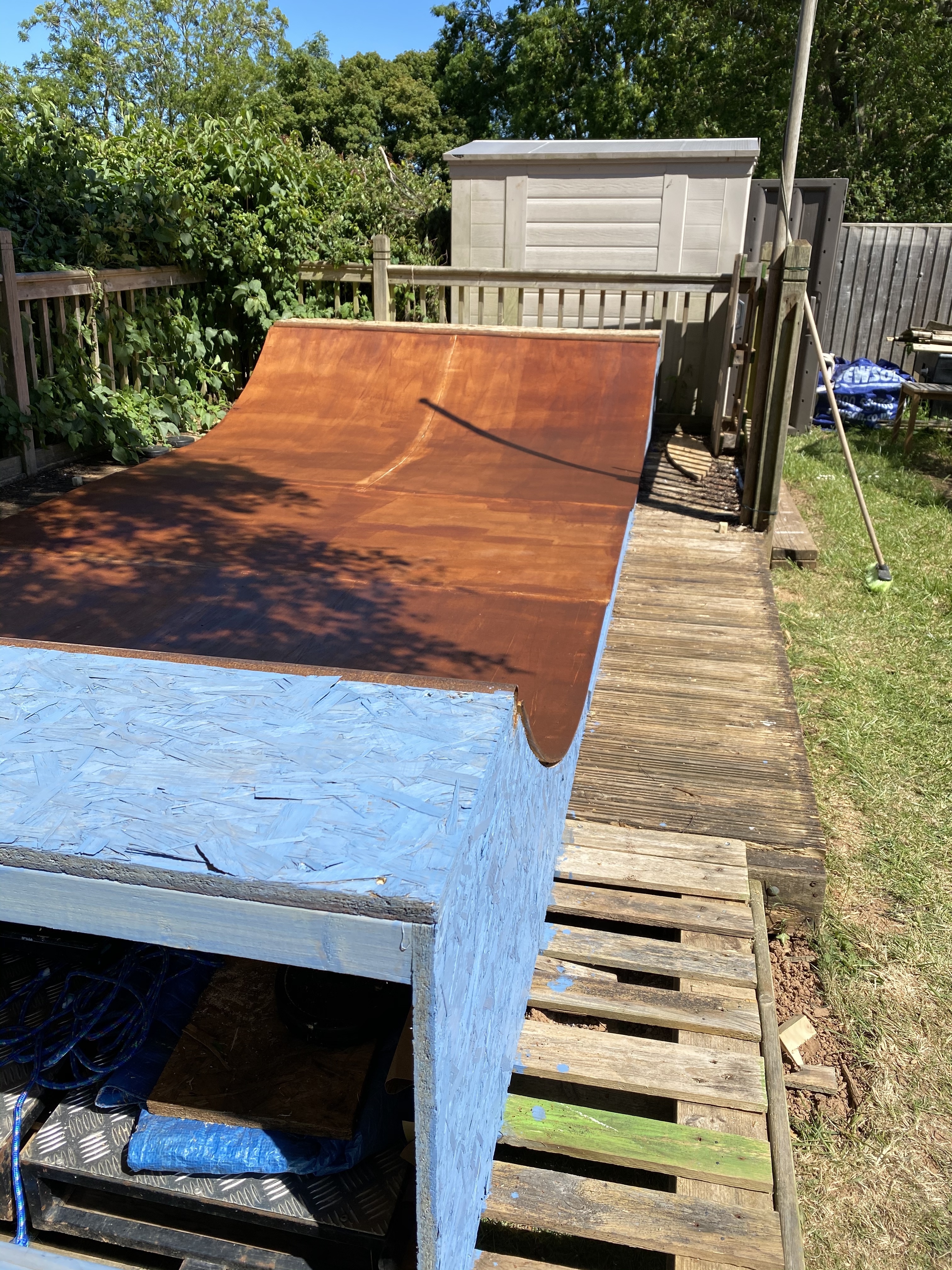 So, this has now become an exterior sheet material / top covering ātestā ramp. Iām going to try various different ideas over time, paints, stains, filler, etc as and when needed. And make it a fun process as opposed to a frustrating one. I canāt beat the weather but if I can come up with a cheap, simple and effective riding surface or easily repairable one then Iāll share what works. And what doesnāt! Thanks for the positive responses - mean a lot!