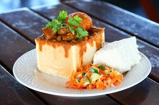 It’s a curry in a hollowed-out half loaf of bread, with the excavated bit on the side to act as a sauce sponge.