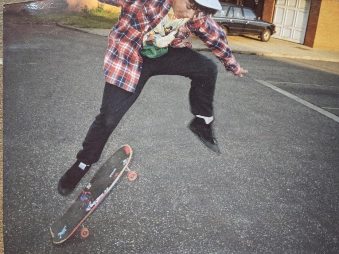I saw a photo of me wearing an LA cap, a Thrasher Julian front board handrail tee and some Stussy chino shorts…unfortunately the fit was ruined by those stinkers on my feet. I think I was back into Fastbreaks after that.