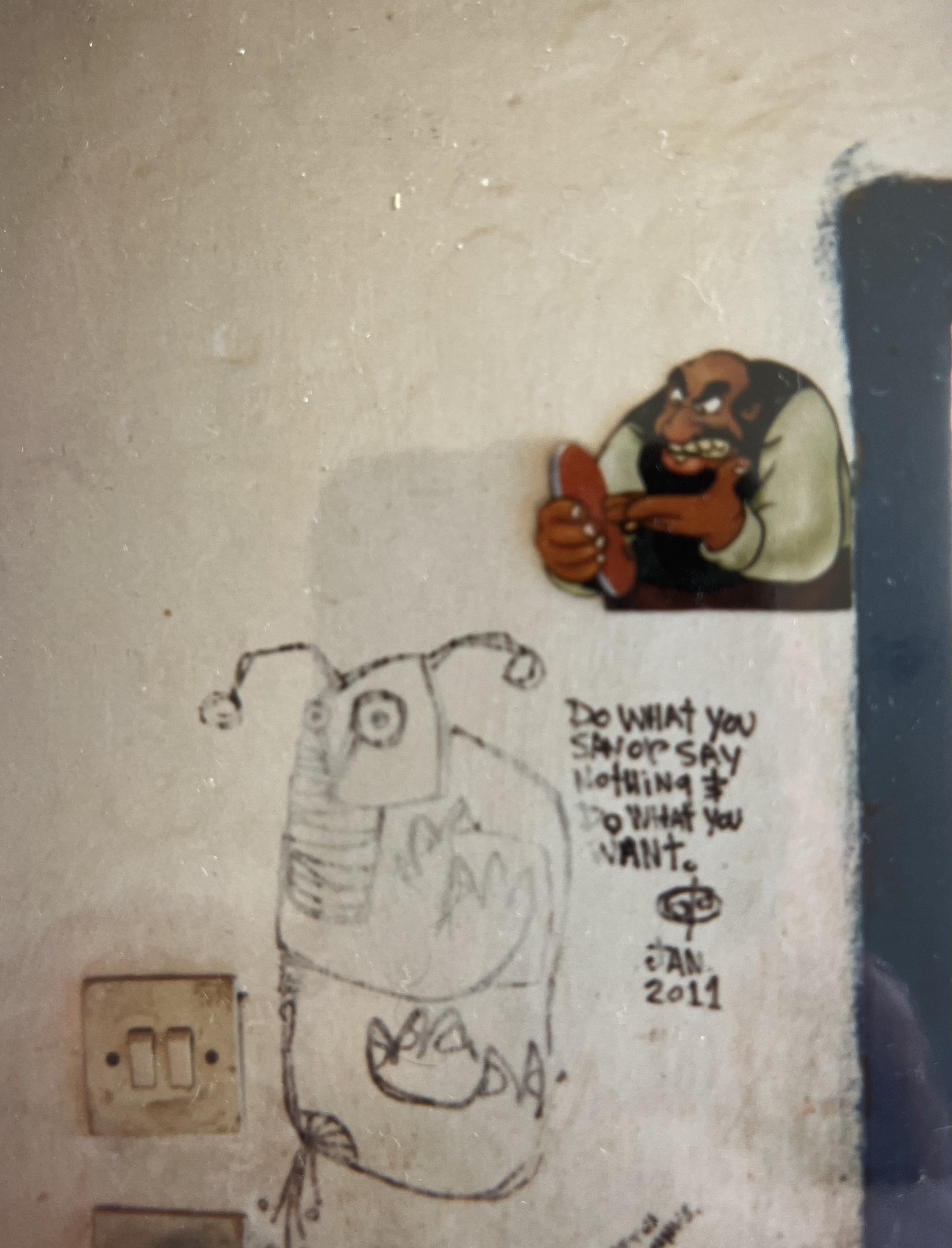 The wall in my room during a Morocco trip with a Duffs Cobnobbler cobbler ad - which dates the photo better than the Thomas Campbell doodle that he futuristicallly dated as 2011.