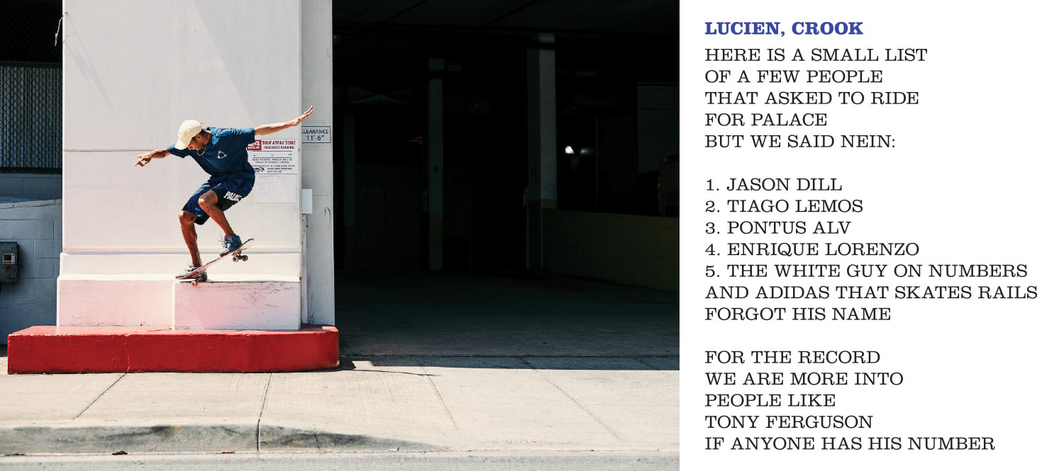 Uhm… I don’t know… I would be psyched… I have some friends over at Palace. I go on a lot of adidas trips with Chewy Cannon and Benny Fairfax. Also we skate together for Wayward Wheels. Those are the homies. I wear a lot of their clothes anyway because they do a lot of collabs with adidas. I would be hyped to ride for Palace cause I think it’s pretty sick. I don’t know… I really don’t know who else honestly. I mean if they wanna hit me up. I don’t know what their situation is though.