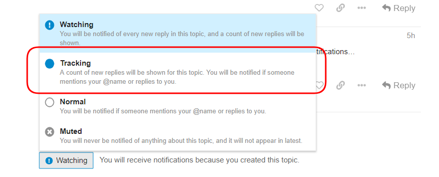 To change this, scroll to bottom of the bottom of the topic you created and change it from ‘Watching’ to ‘Tracking’ to have it just display the unread count.