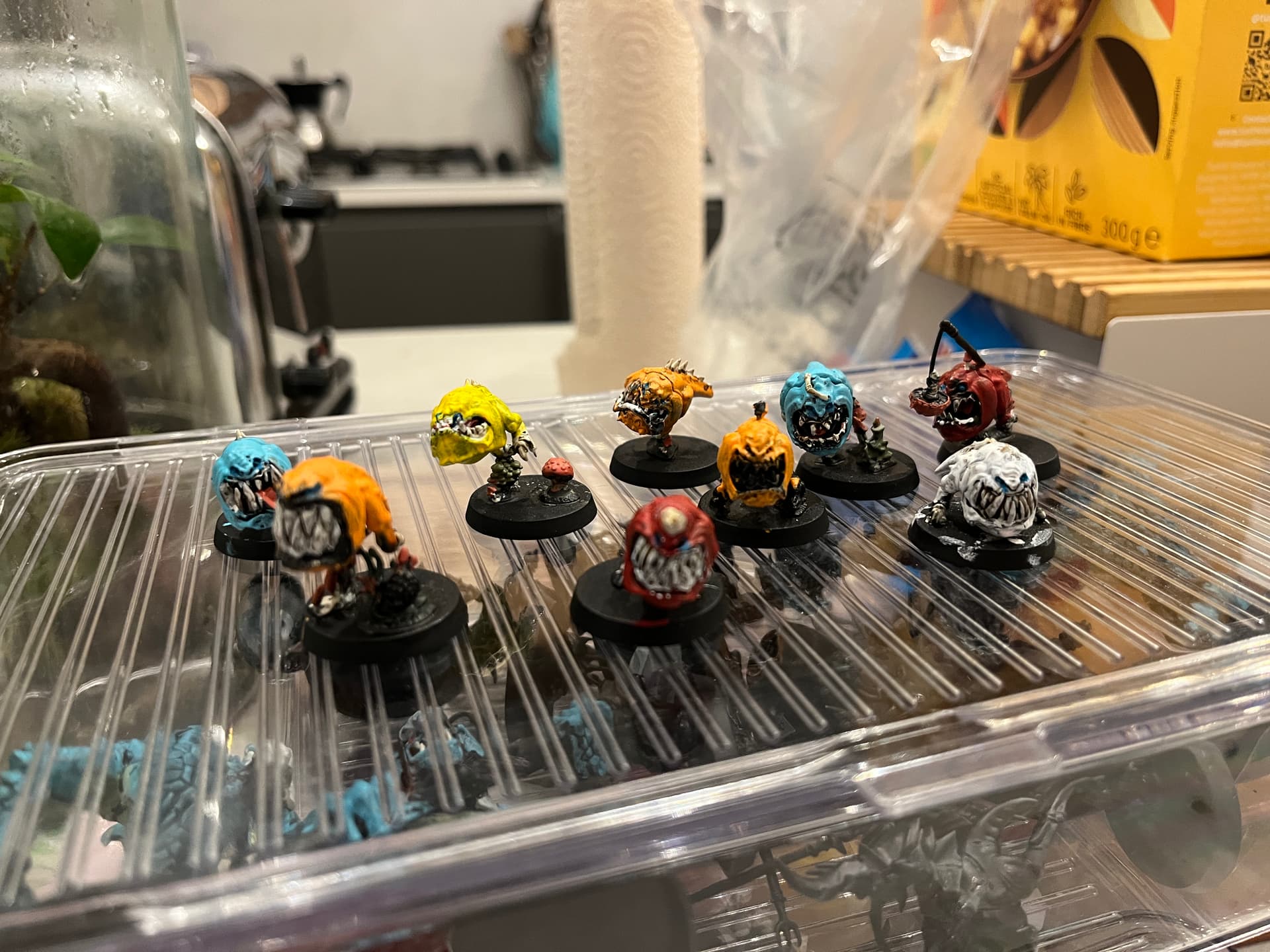 Squig herd complete. I forgot one squig’s teeth, claws and shrooms but I kind of like him like that.